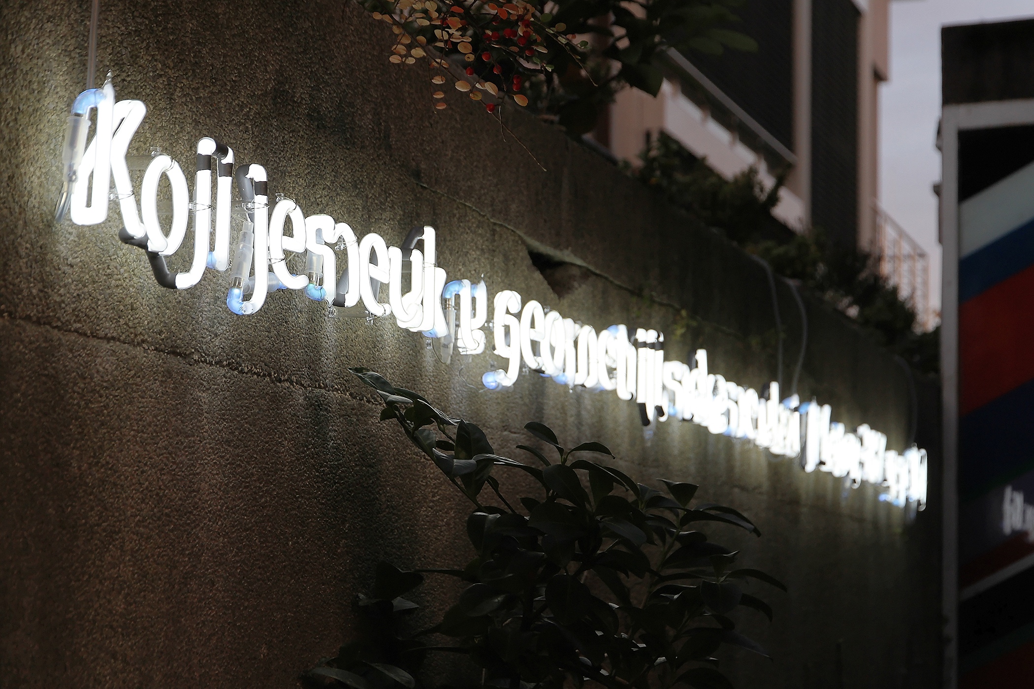 A textual artwork made out of argon light tubes at the entrance of the exhibition venue. It said: