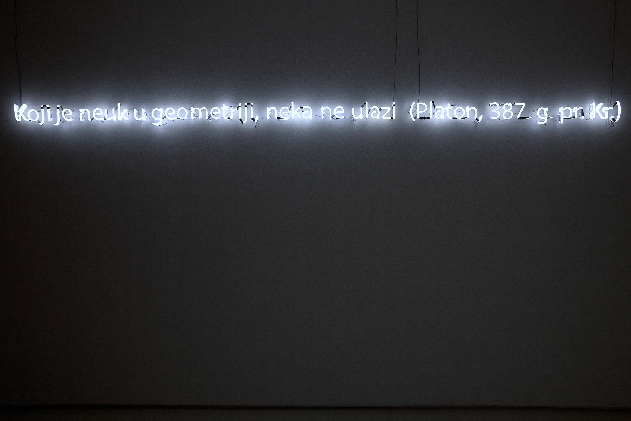 Let no one ignorant of geometry enters. (Plato, 387 B.C.). It is believed that this inscription had been placed at the entrance of Plato’s Academy. In this case, geometry can be interpreted in two ways: literally – as a branch of mathematics – and in the context of the inscription as such, as a symbol of abstract thinking aiming at complete understanding, i.e. knowledge. The meaning of the text is linked directly with the work of Vjenceslav Richter, but dislocating the inscription into an exhibition venue and thus multiplying its semantic levels.