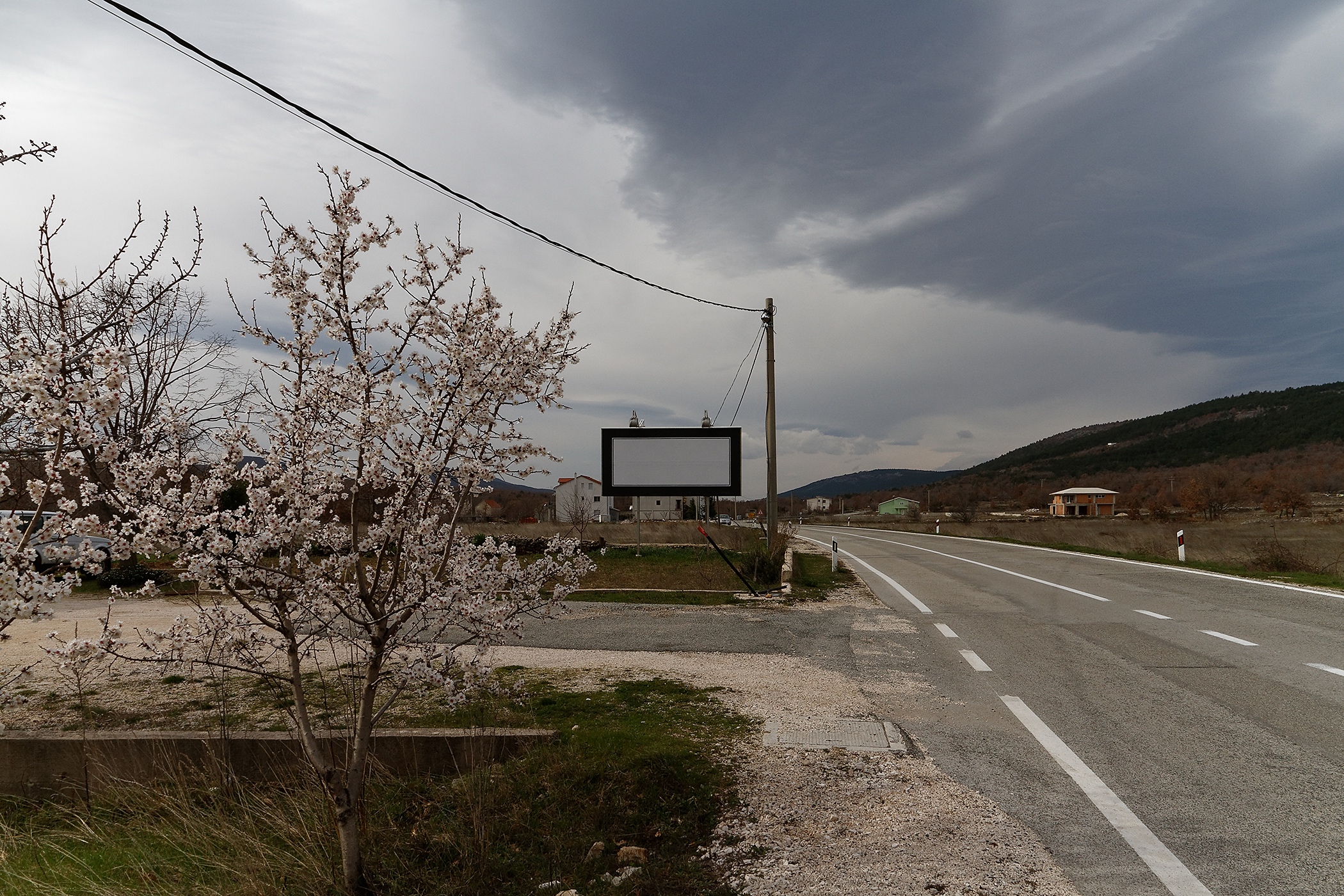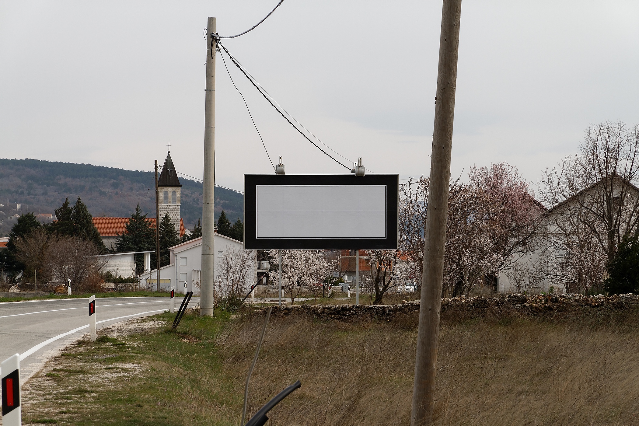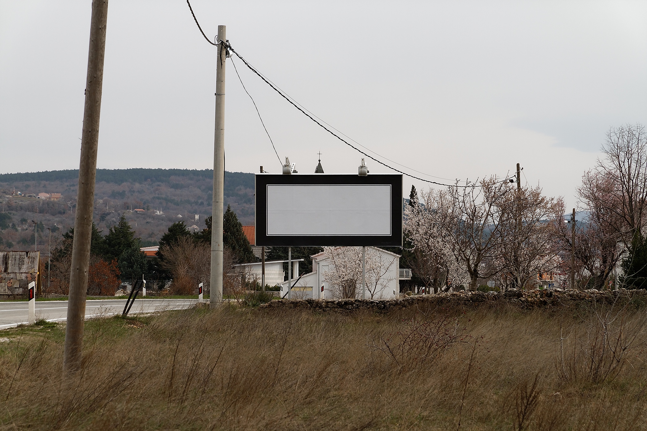 The work was produced in the form of a billboard and placed in an advertising space in Cista Provo, Croatia. The black framed format clearly suggests an obituary. In the Dalmatian hinterland, obituaries were traditionally placed on tree trunks along the road. It was the only form of advertising in these areas before the spread of public advertising.