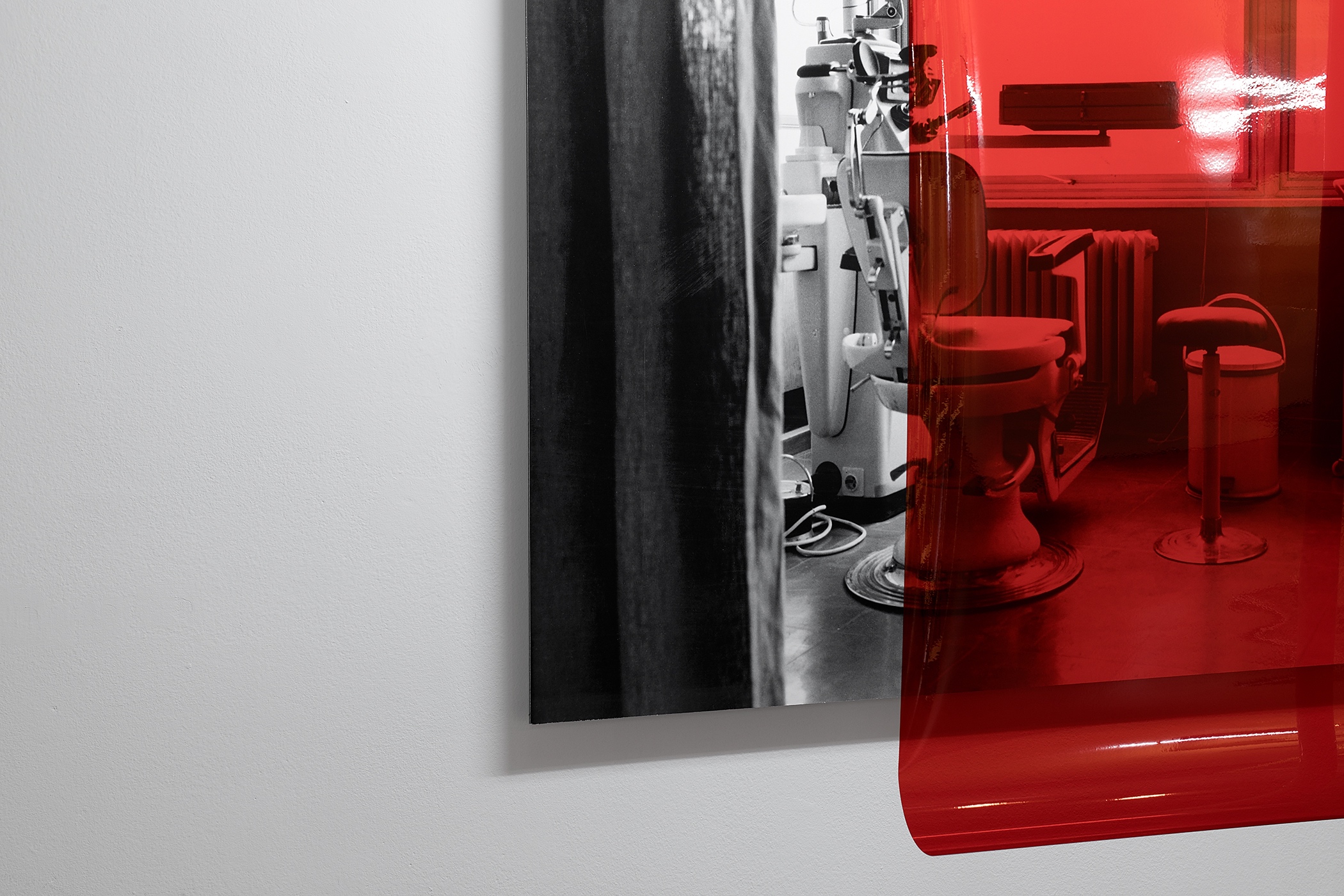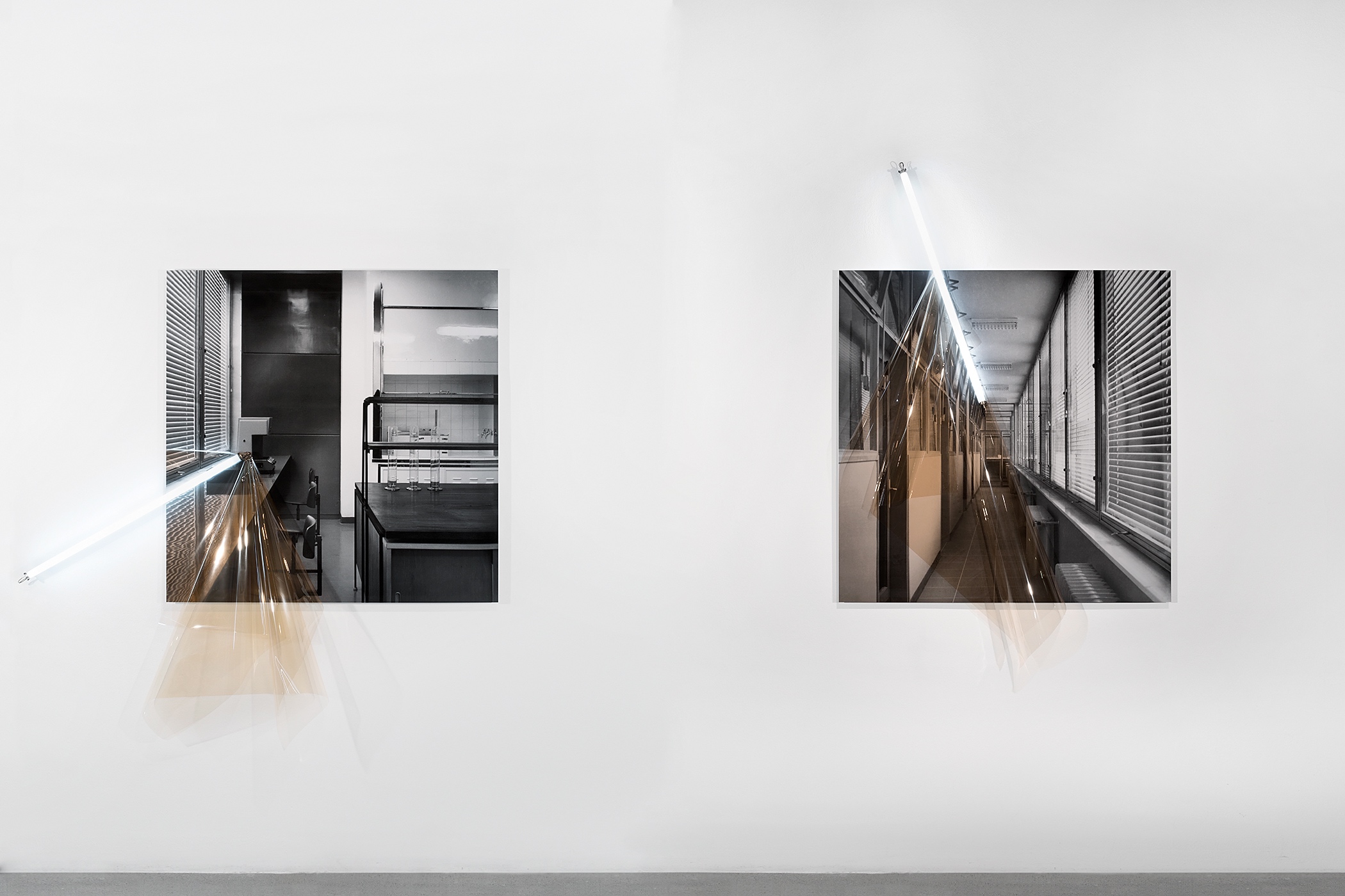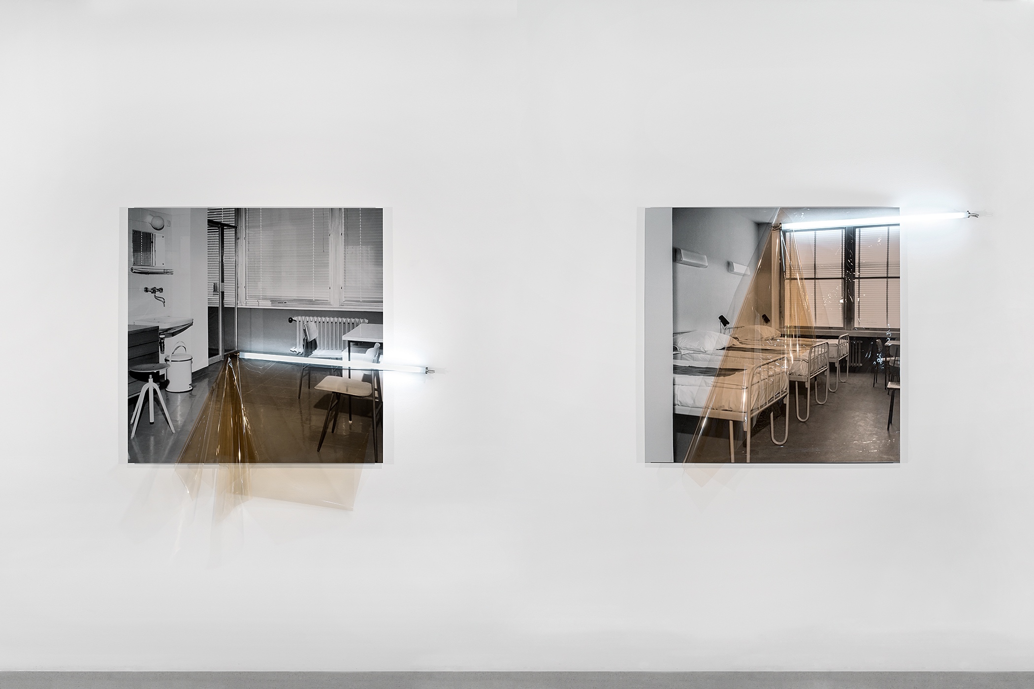 The wall works are hybrids at the intersection between photography, relief, and object. It consists of digital prints of archival photographs of the hospital’s exterior taken in 1965, before the hospital’s inauguration. Each print is mounted on an aluminum board and forms a background for industrial filters for color correction that have been fixed to the photographs with fluorescent light tubes.