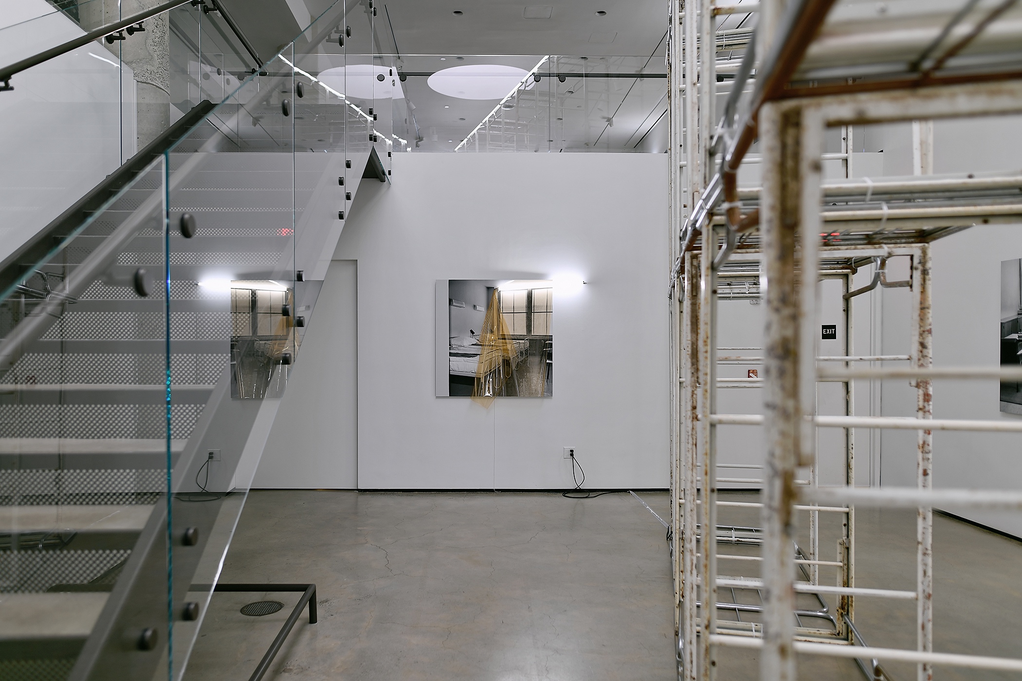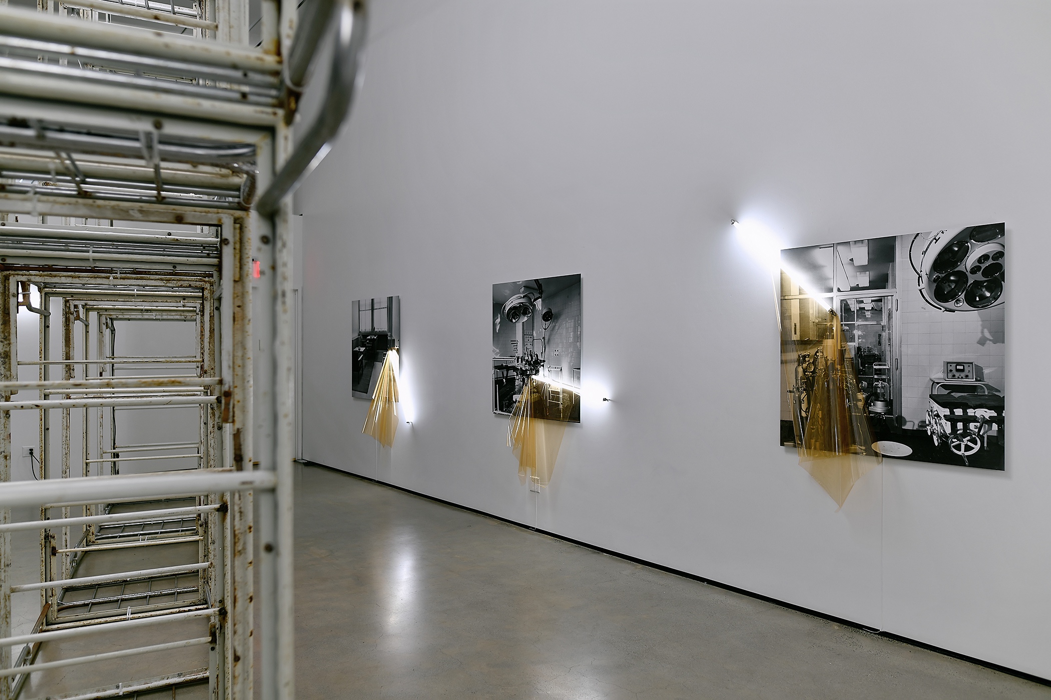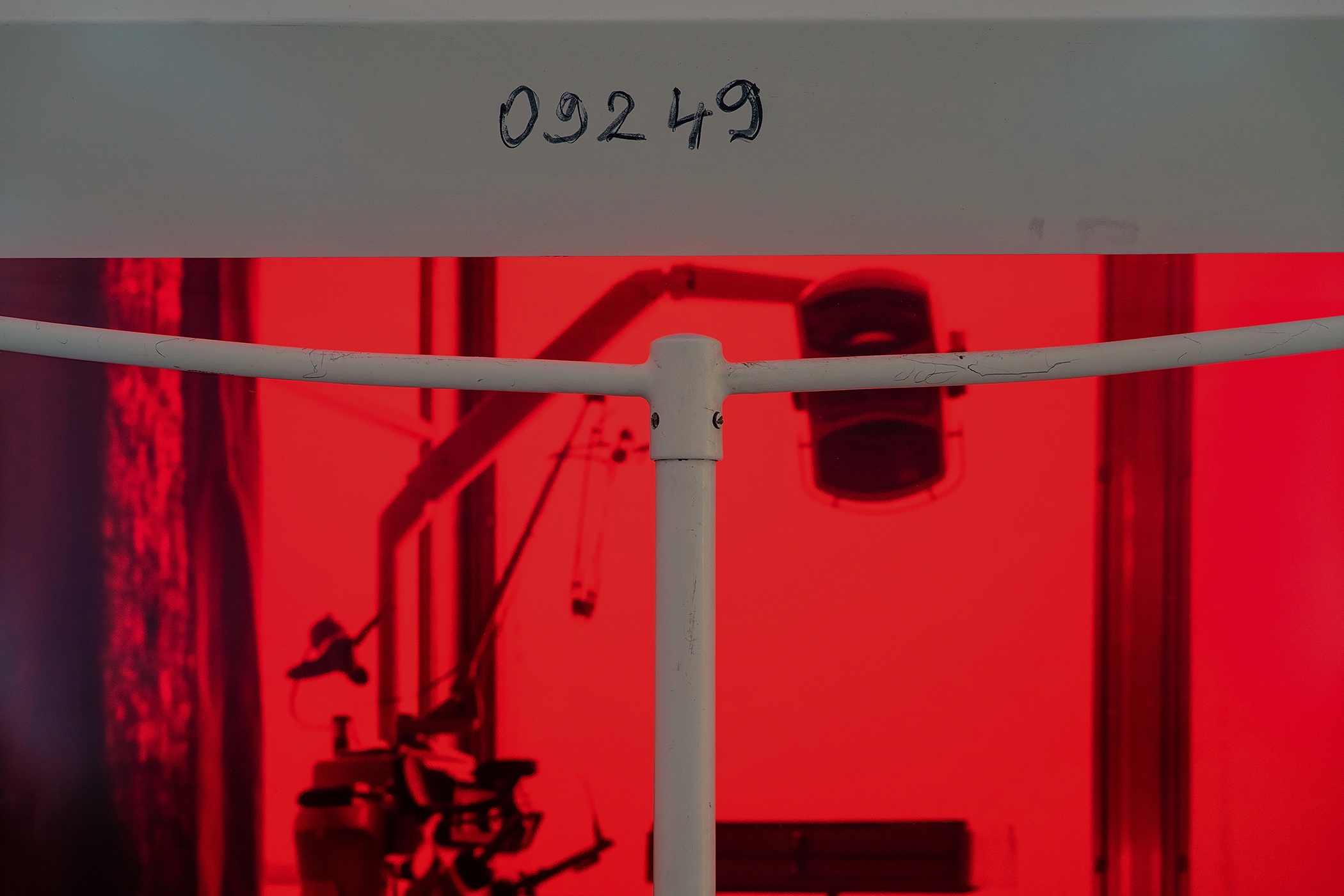 The wall works are hybrids at the intersection between photography, relief, and object. It consists of digital prints of archival photographs of the hospital’s exterior taken in 1965, before the hospital’s inauguration. Each print is mounted on an aluminum board and forms a background for industrial filters for color correction that have been fixed to the photographs with fluorescent light tubes.