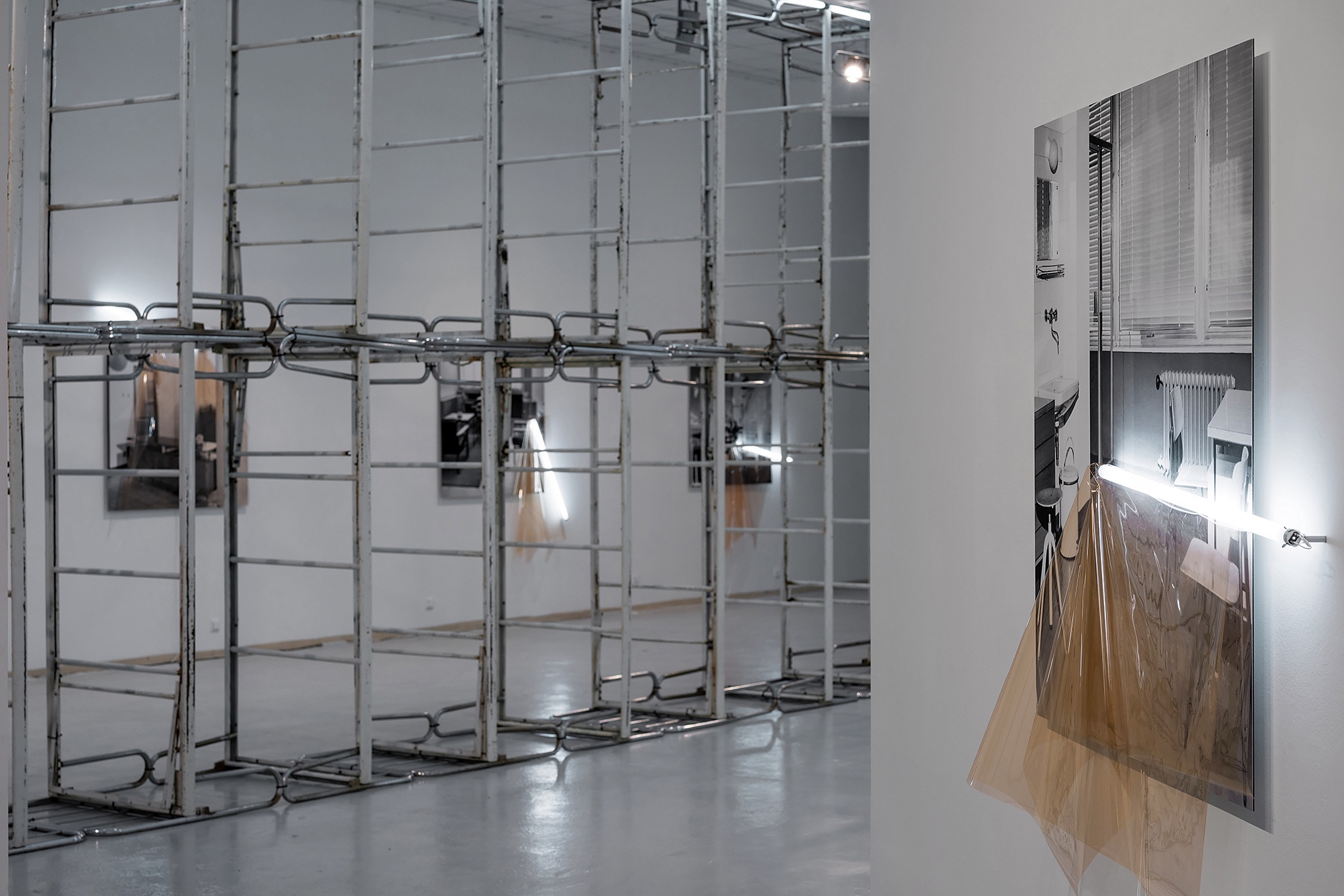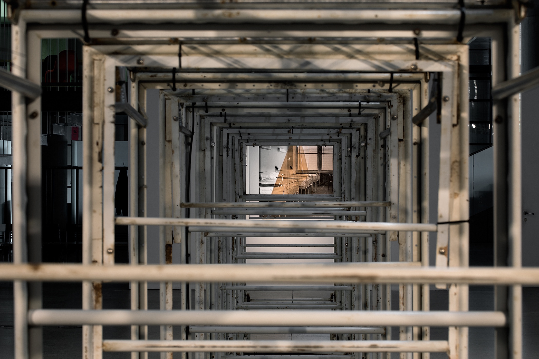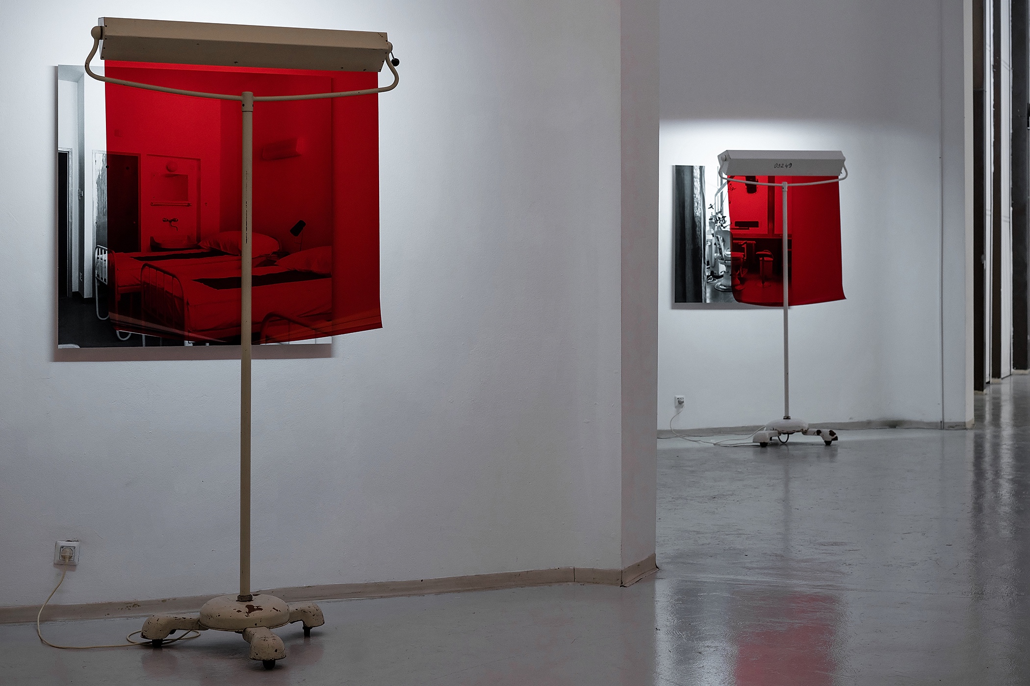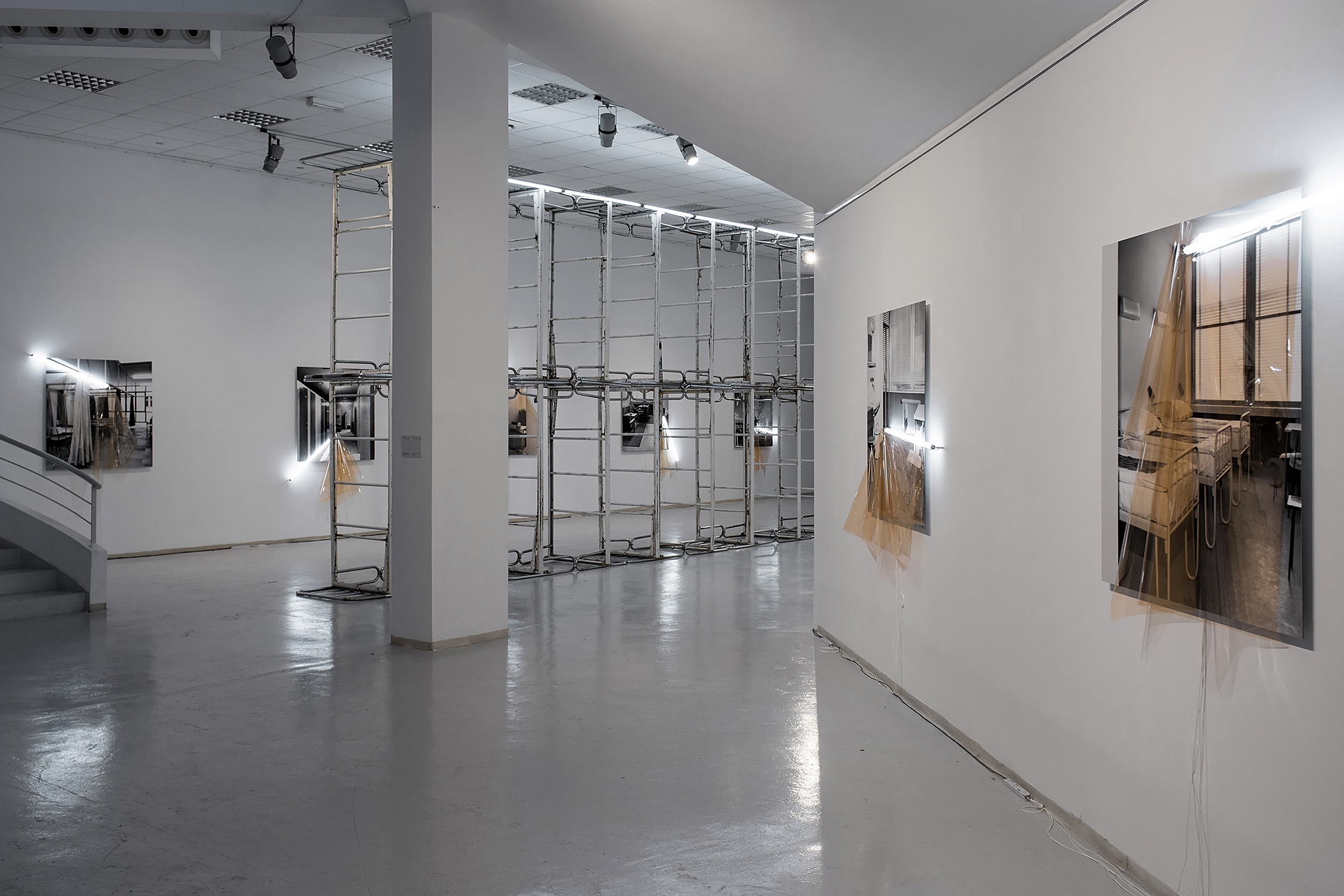 The memory of the represented space is enhanced by the introduction of old bactericidal lamps and scrapped beds taken from the same hospital. With the form of a large installation structure made of iron beds, modernist elements of the architecture of the hospital’s main building are cited. The objects of utility themselves – as carriers of memory – are almost completely anonymized through the geometry of the verticals and horizontals of the newly created architecture.