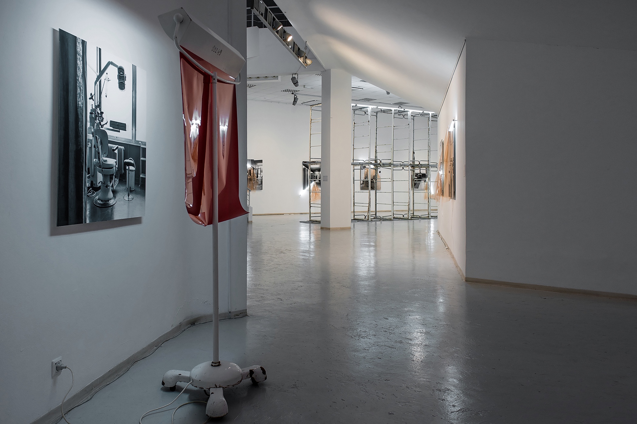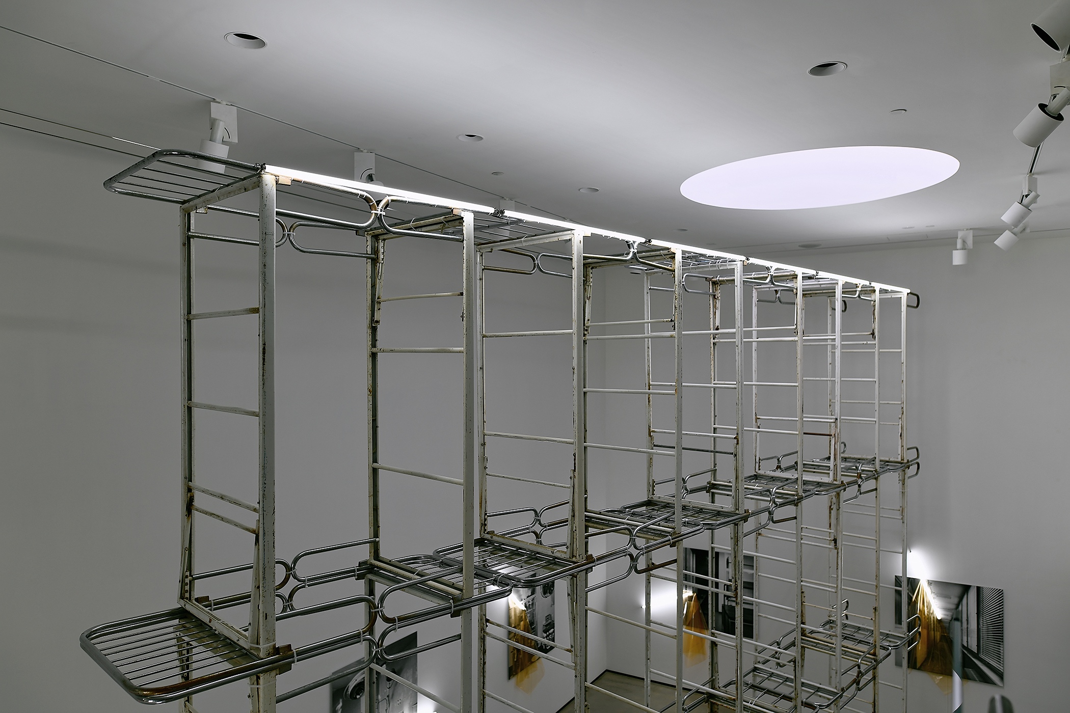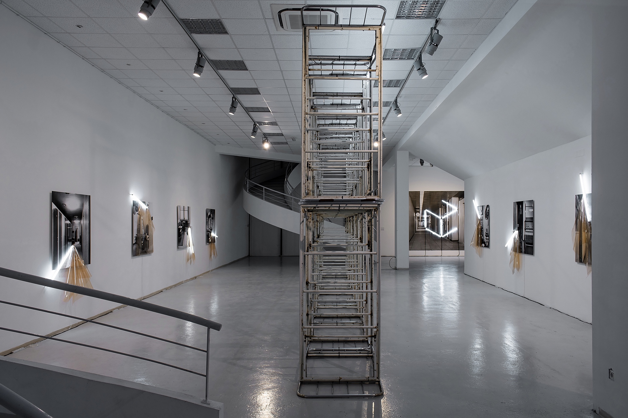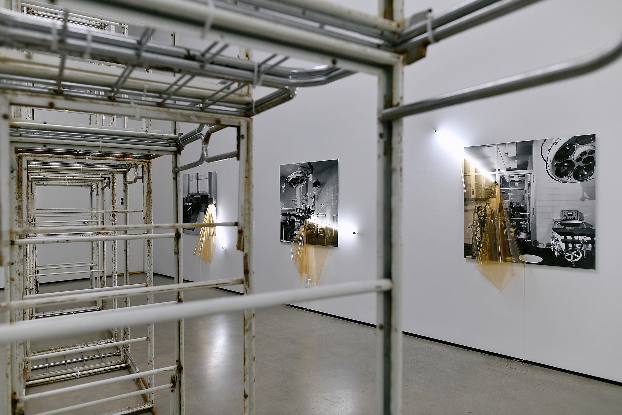 The memory of the represented space is enhanced by the introduction of old bactericidal lamps and scrapped beds taken from the same hospital. With the form of a large installation structure made of iron beds, modernist elements of the architecture of the hospital’s main building are cited. The objects of utility themselves – as carriers of memory – are almost completely anonymized through the geometry of the verticals and horizontals of the newly created architecture.