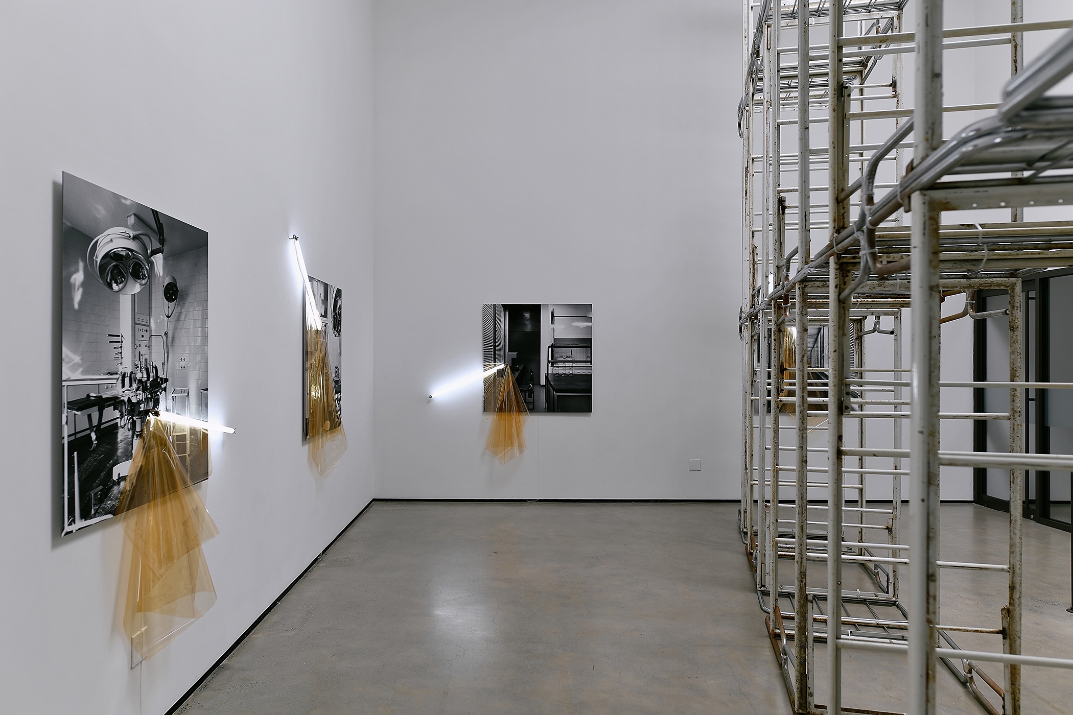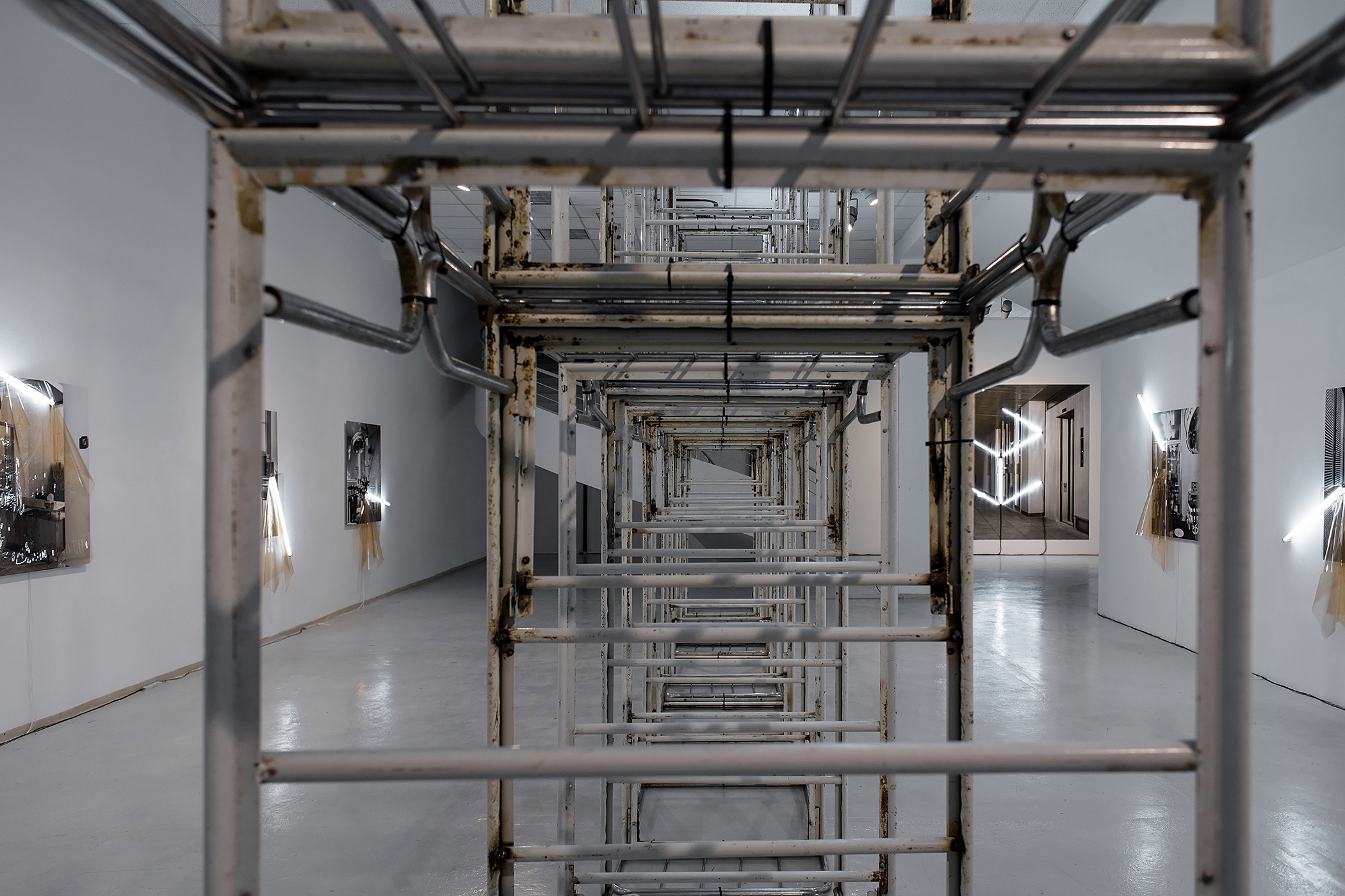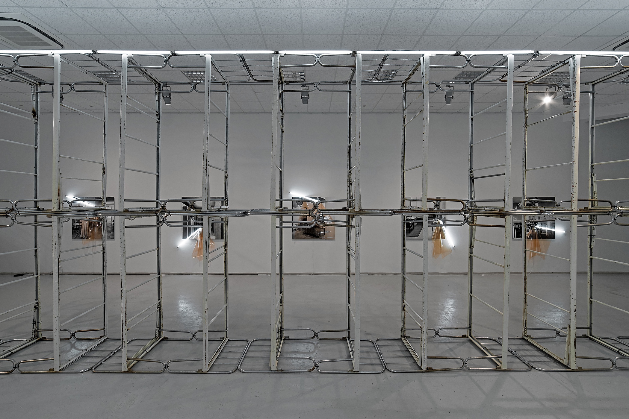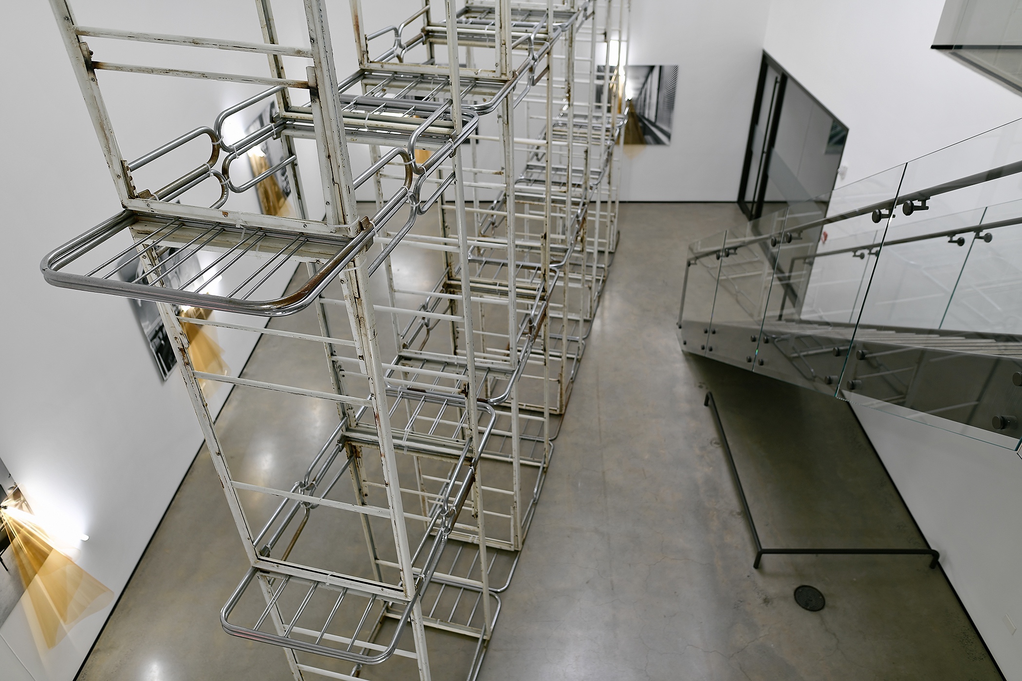 The memory of the represented space is enhanced by the introduction of old bactericidal lamps and scrapped beds taken from the same hospital. With the form of a large installation structure made of iron beds, modernist elements of the architecture of the hospital’s main building are cited. The objects of utility themselves – as carriers of memory – are almost completely anonymized through the geometry of the verticals and horizontals of the newly created architecture.