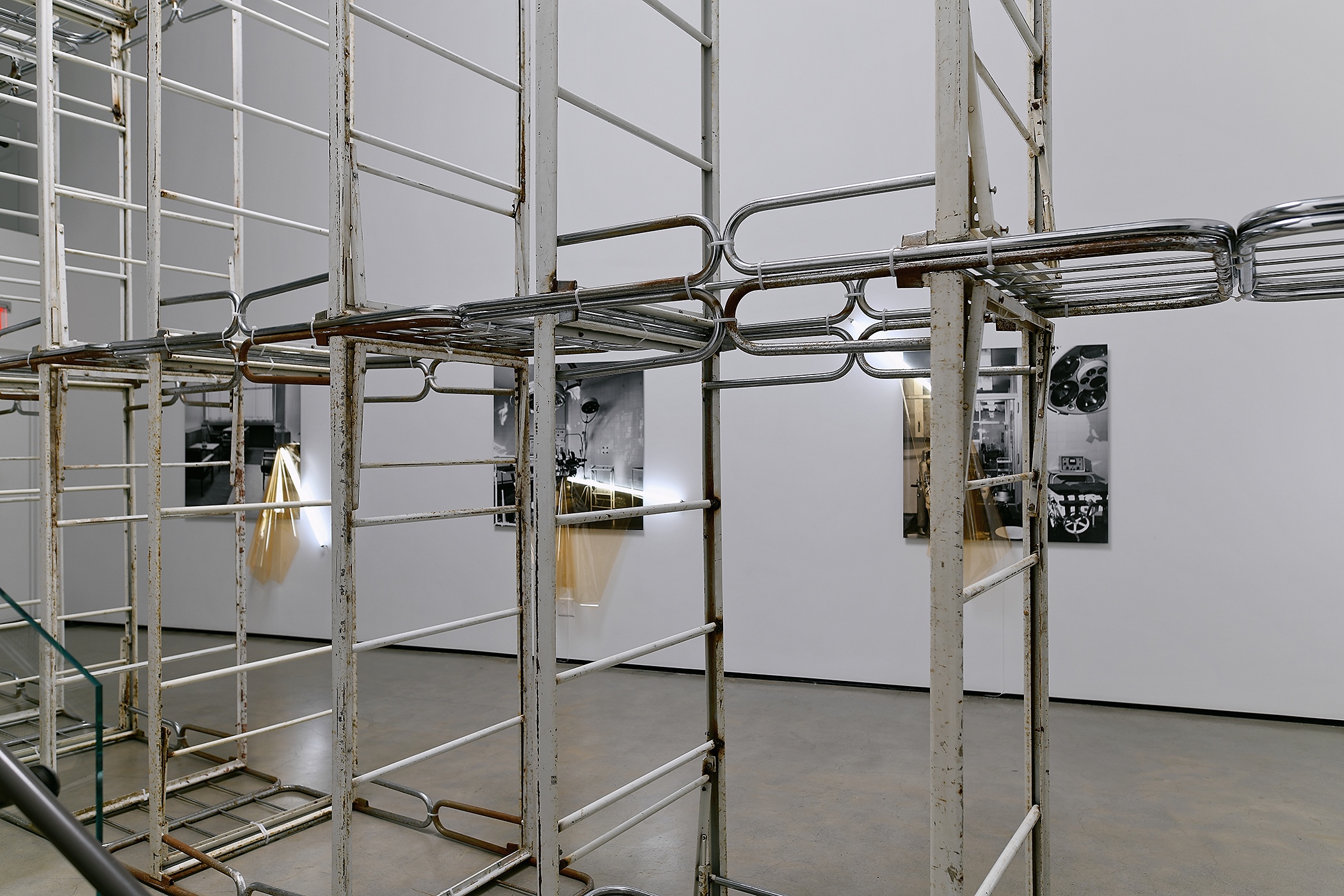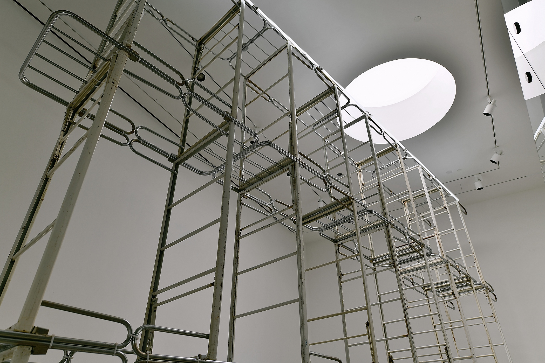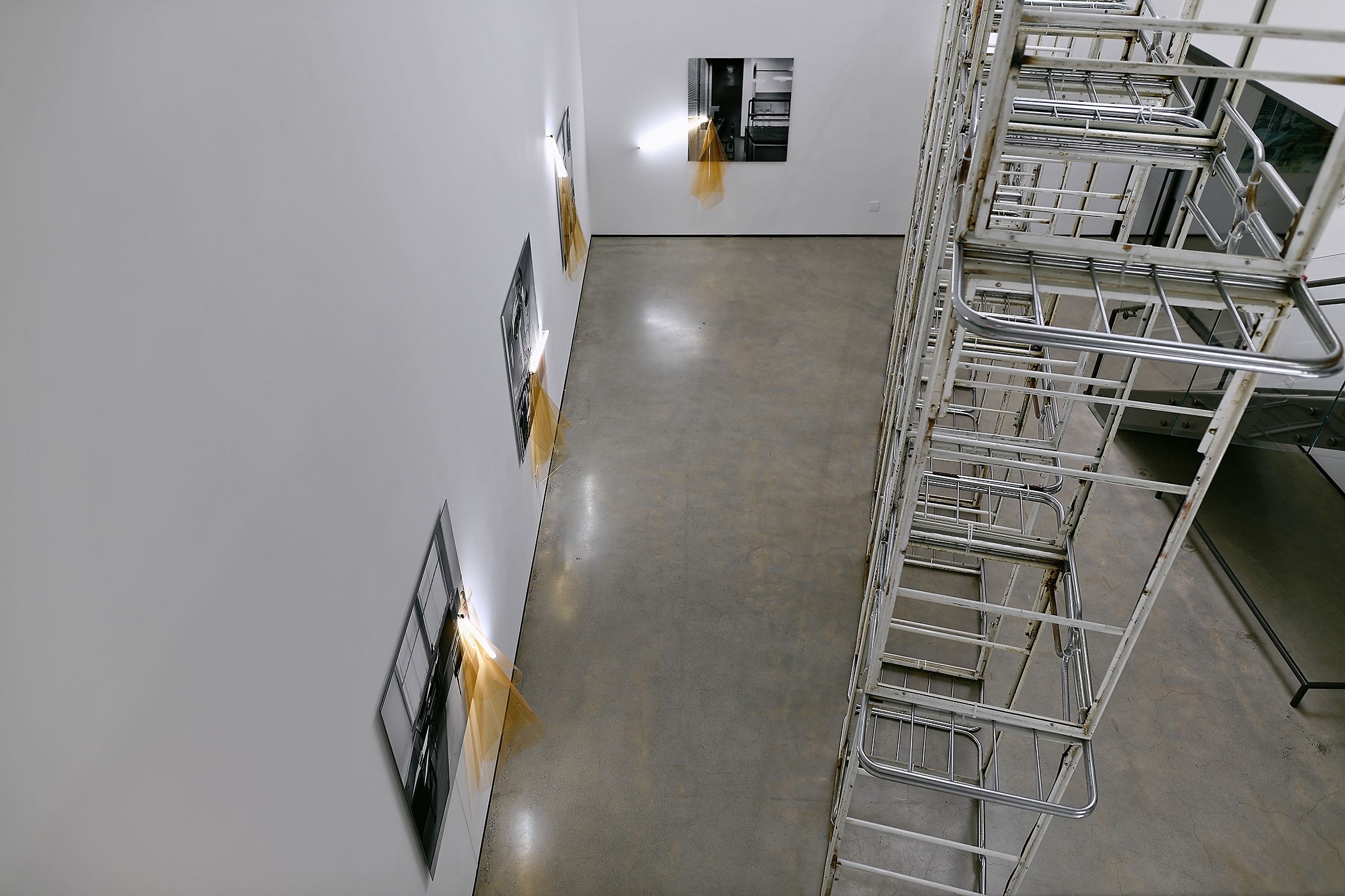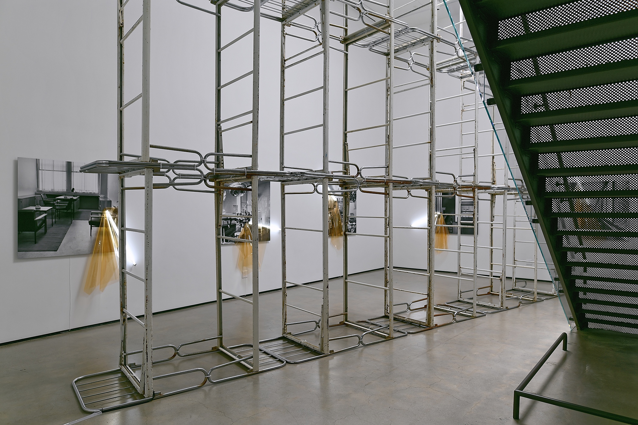 The memory of the represented space is enhanced by the introduction of old bactericidal lamps and scrapped beds taken from the same hospital. With the form of a large installation structure made of iron beds, modernist elements of the architecture of the hospital’s main building are cited. The objects of utility themselves – as carriers of memory – are almost completely anonymized through the geometry of the verticals and horizontals of the newly created architecture.