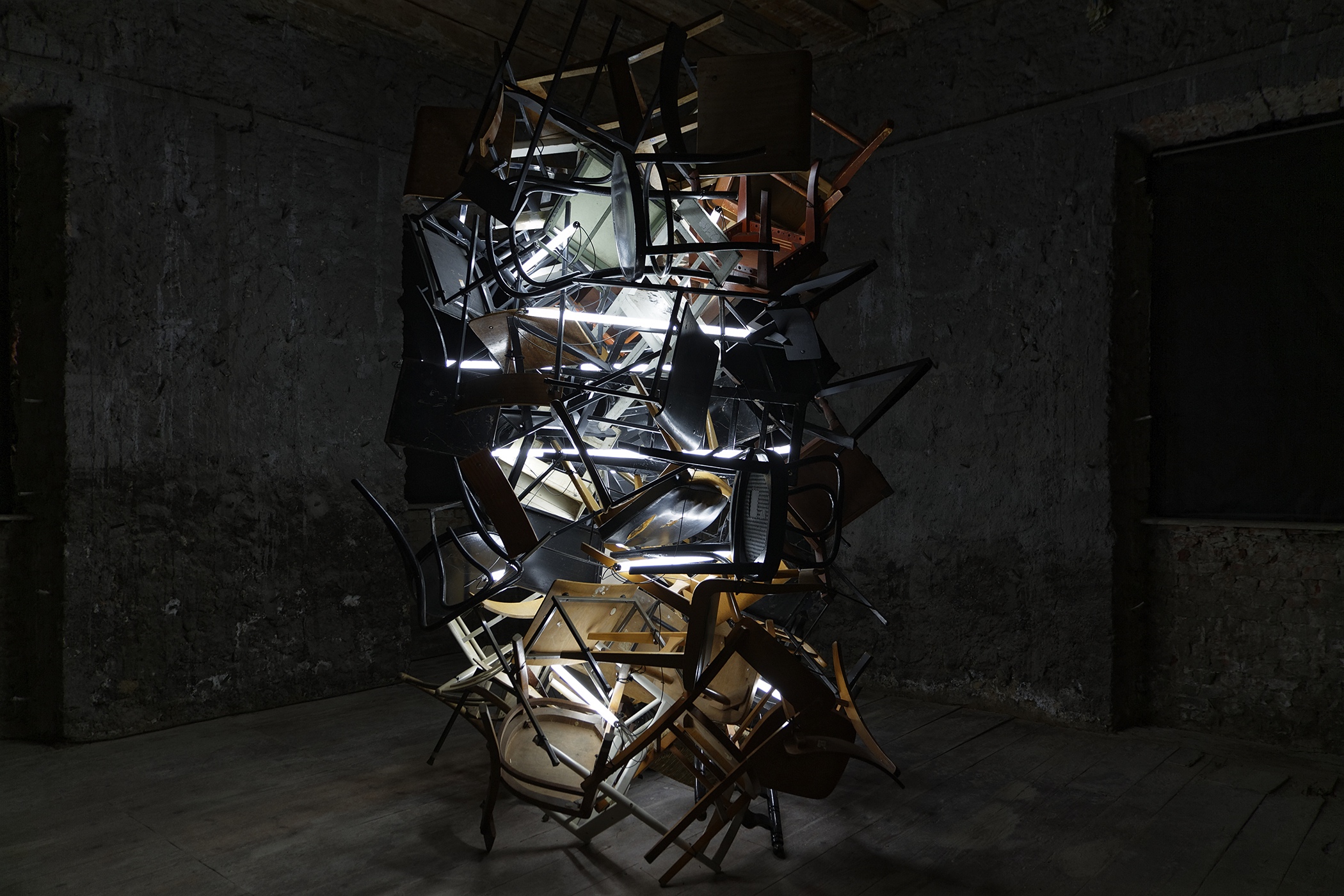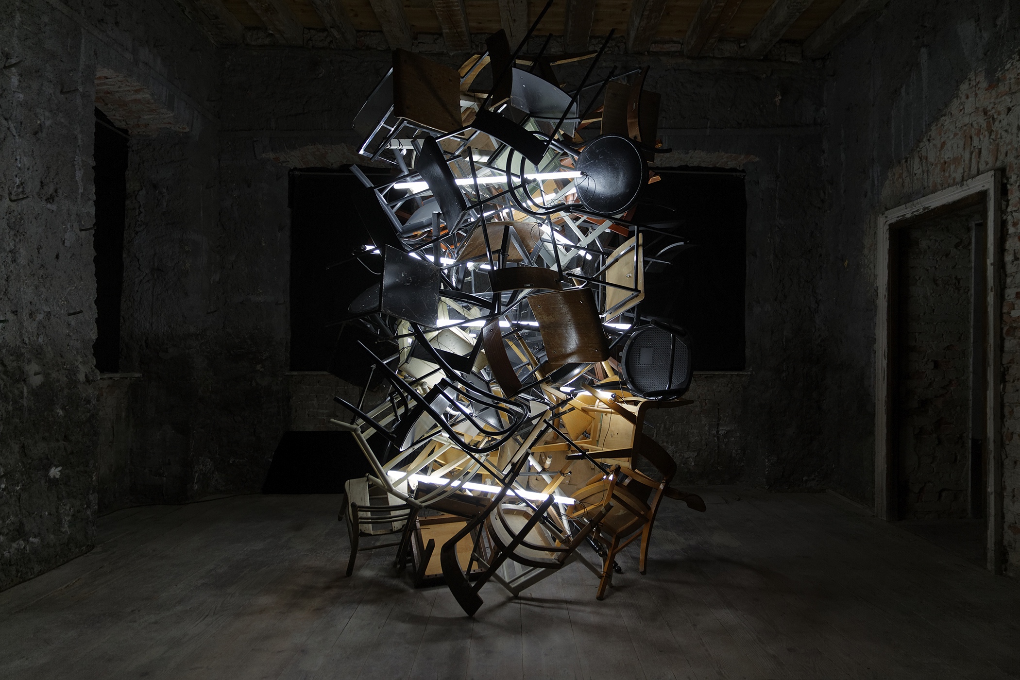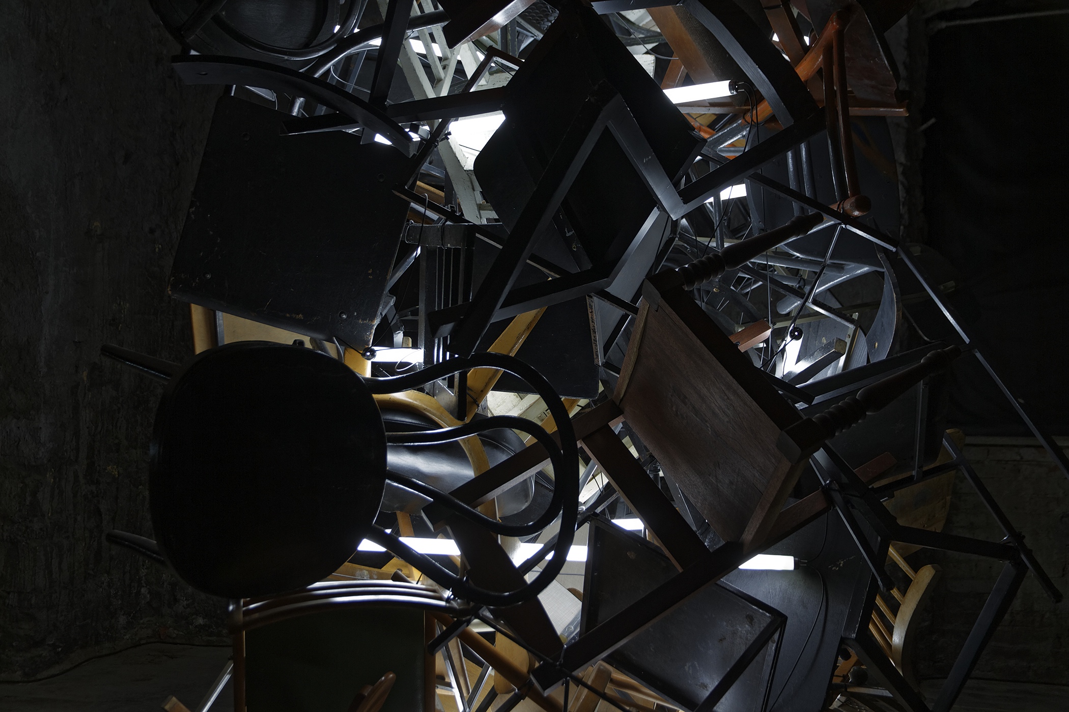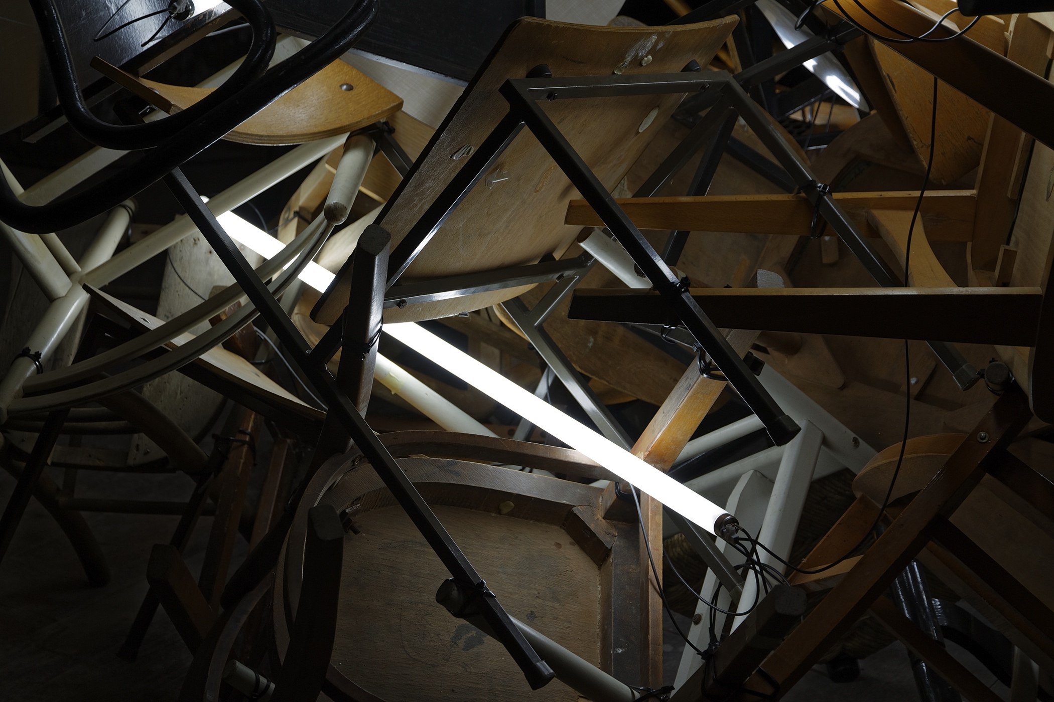 The installation was made from chairs borrowed from Slovenian National Theatre Drama in Ljubljana. Items were removed from their original context, preventing their use as functional objects and thus gaining a new artistic context. The procedure is very straightforward, there is no simulation – the chairs are attached to a seemingly chaotic pile. Now come to the fore their shape, their ability to create a visually interesting whole. The chairs, each carrying their own story, indicate traces of wear, in contrast to the luminous fluorescent tubes placed within the installation. On one side are worn objects of daily use, on the other cold, the light that defines them is almost symbolically transformed into the exhibition display. The process ends when, after the closing of the exhibition, the chairs are returned to the owner in their original context. No penetration of art and real life does not stop there, because when the items become mere objects again, are enriched by the memory of their artistic existence.