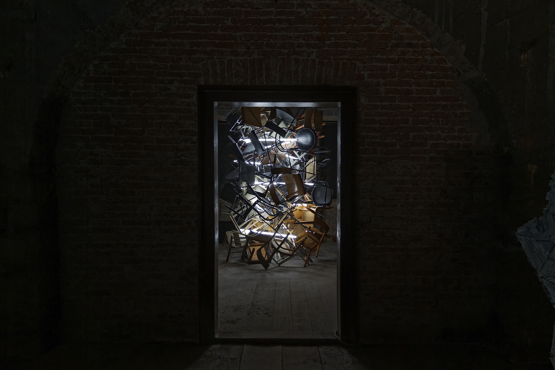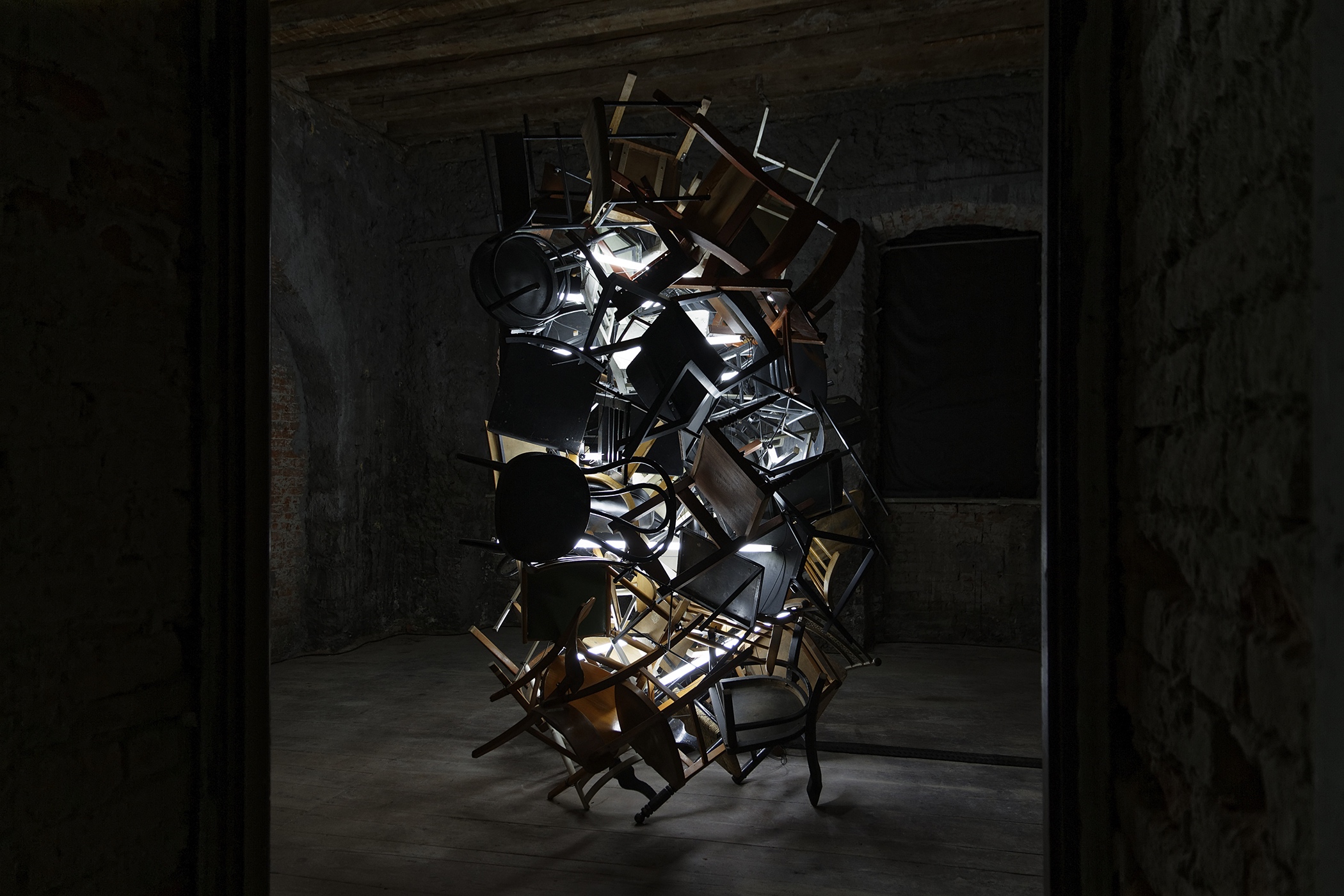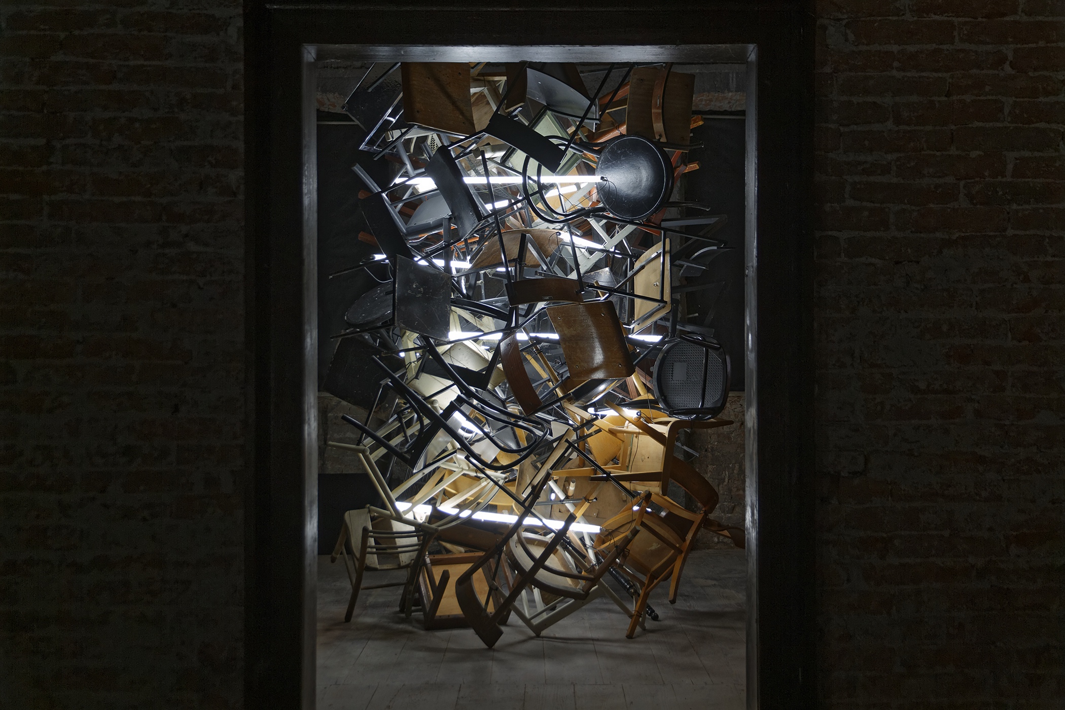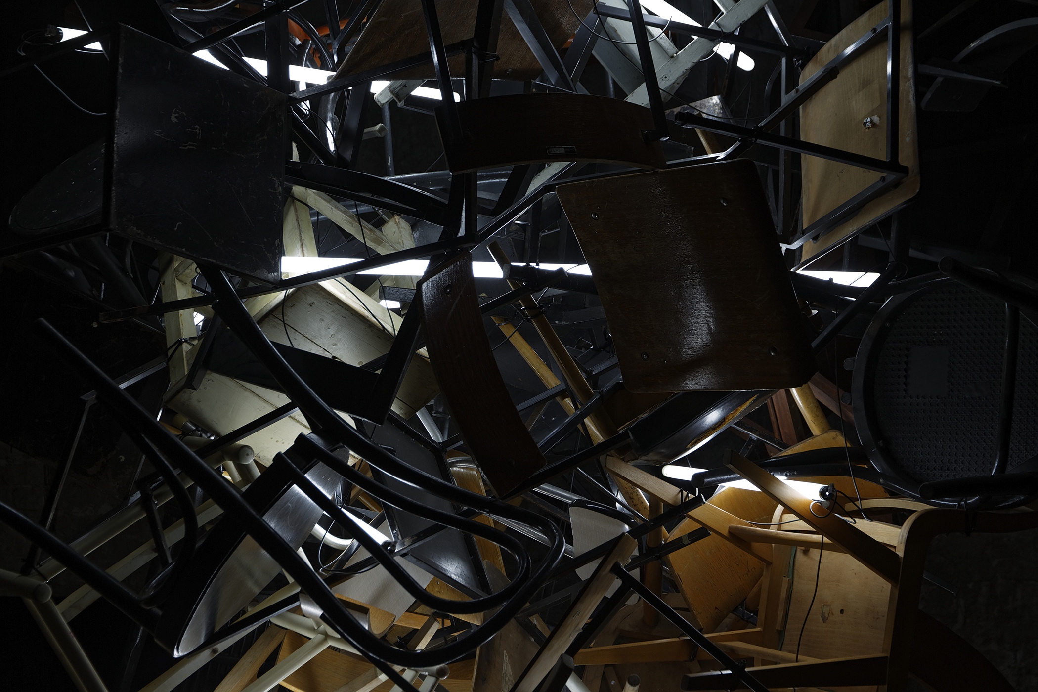 The installation was made from chairs borrowed from Slovenian National Theatre Drama in Ljubljana. Items were removed from their original context, preventing their use as functional objects and thus gaining a new artistic context. The procedure is very straightforward, there is no simulation – the chairs are attached to a seemingly chaotic pile. Now come to the fore their shape, their ability to create a visually interesting whole. The chairs, each carrying their own story, indicate traces of wear, in contrast to the luminous fluorescent tubes placed within the installation. On one side are worn objects of daily use, on the other cold, the light that defines them is almost symbolically transformed into the exhibition display. The process ends when, after the closing of the exhibition, the chairs are returned to the owner in their original context. No penetration of art and real life does not stop there, because when the items become mere objects again, are enriched by the memory of their artistic existence.