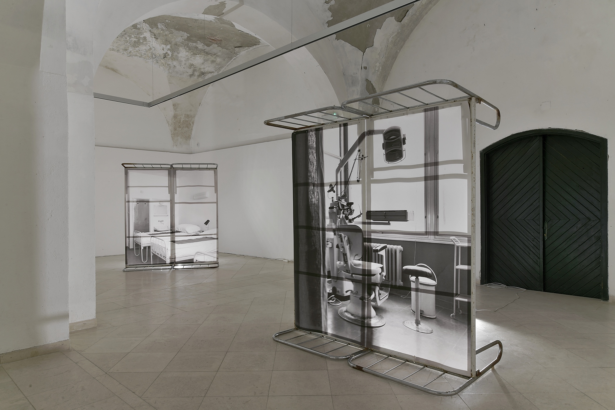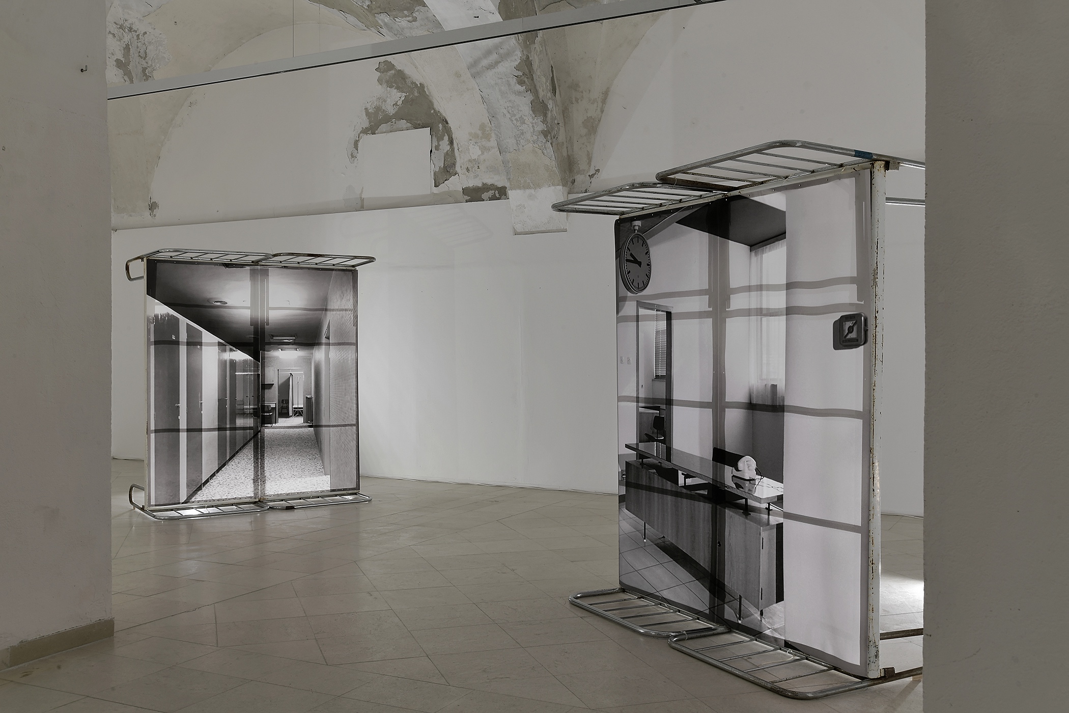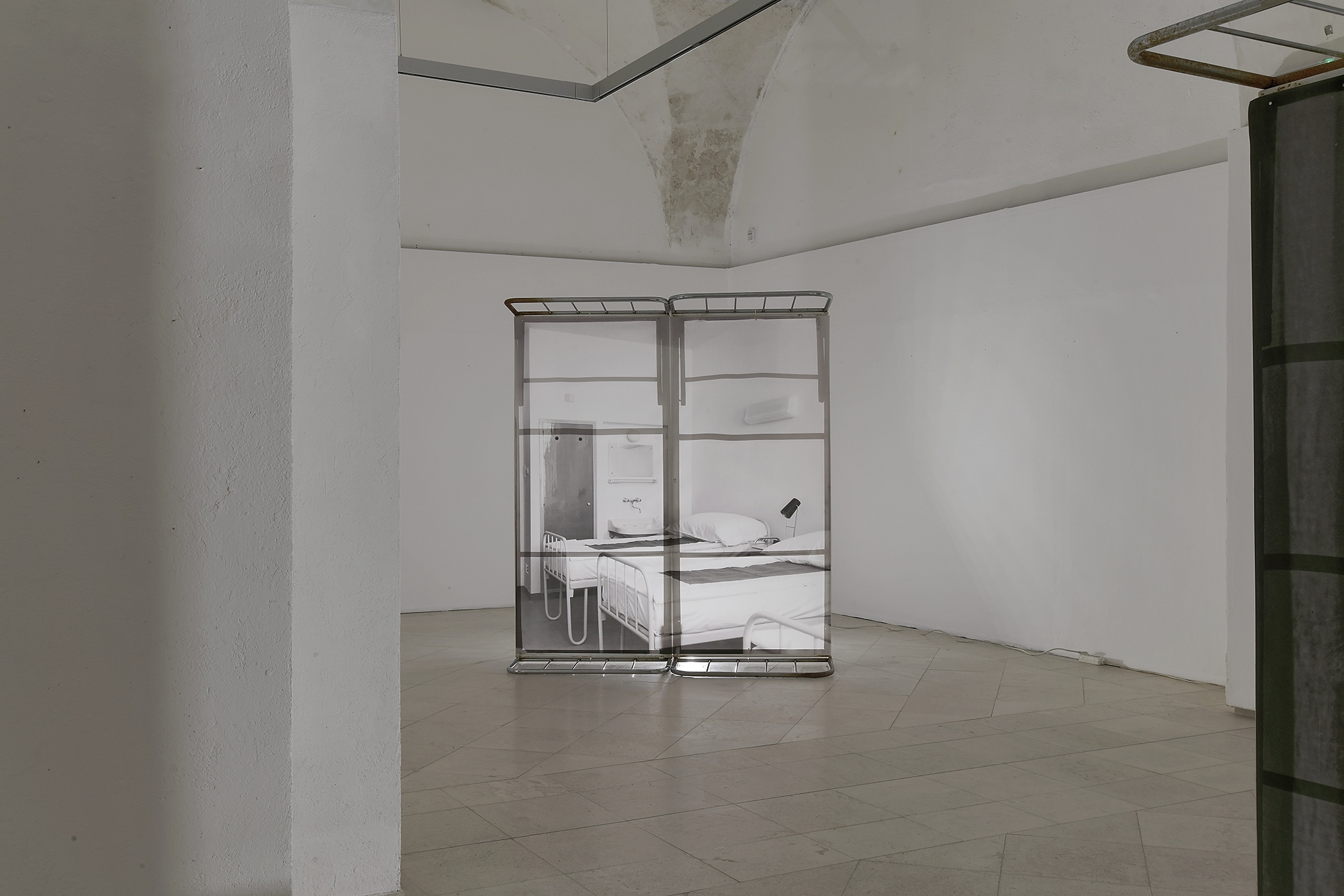 The work is a hybrid of photography and light installation. It consists of digital prints of archival photographs of the hospital’s interior taken in 1965, before the hospital’s inauguration. The photographs represent a clinical view, distanced and cold, and include a temporal distance from the represented subjects, pointing out the relationship between place and document. Each print is mounted on the pair of vertically placed old hospital beds, as a freestanding object displayed in space. Beds are not only props of the past in the role of artistic installation, but at the same, they represent some kind of constructions, frames for photographs, and bearers of a certain memory.