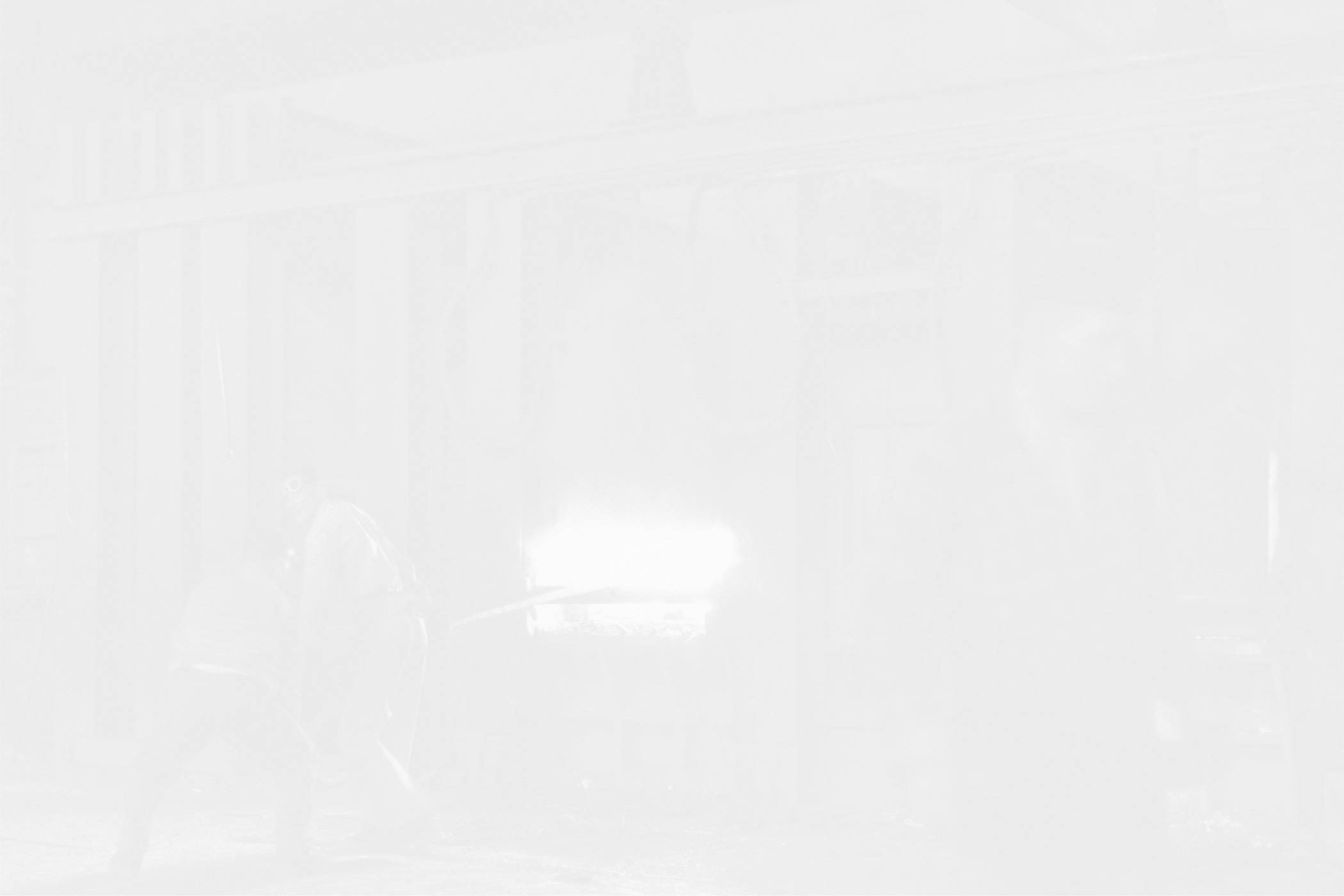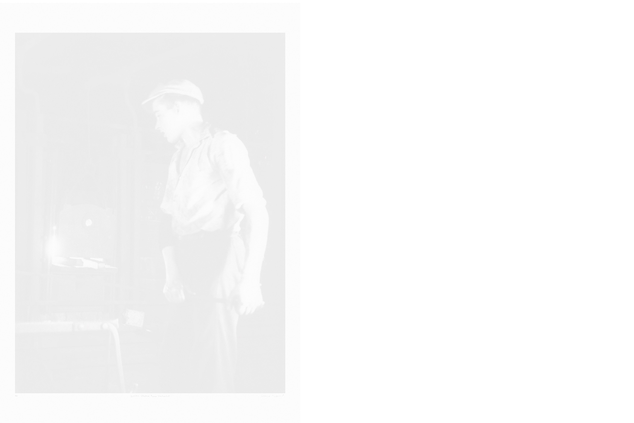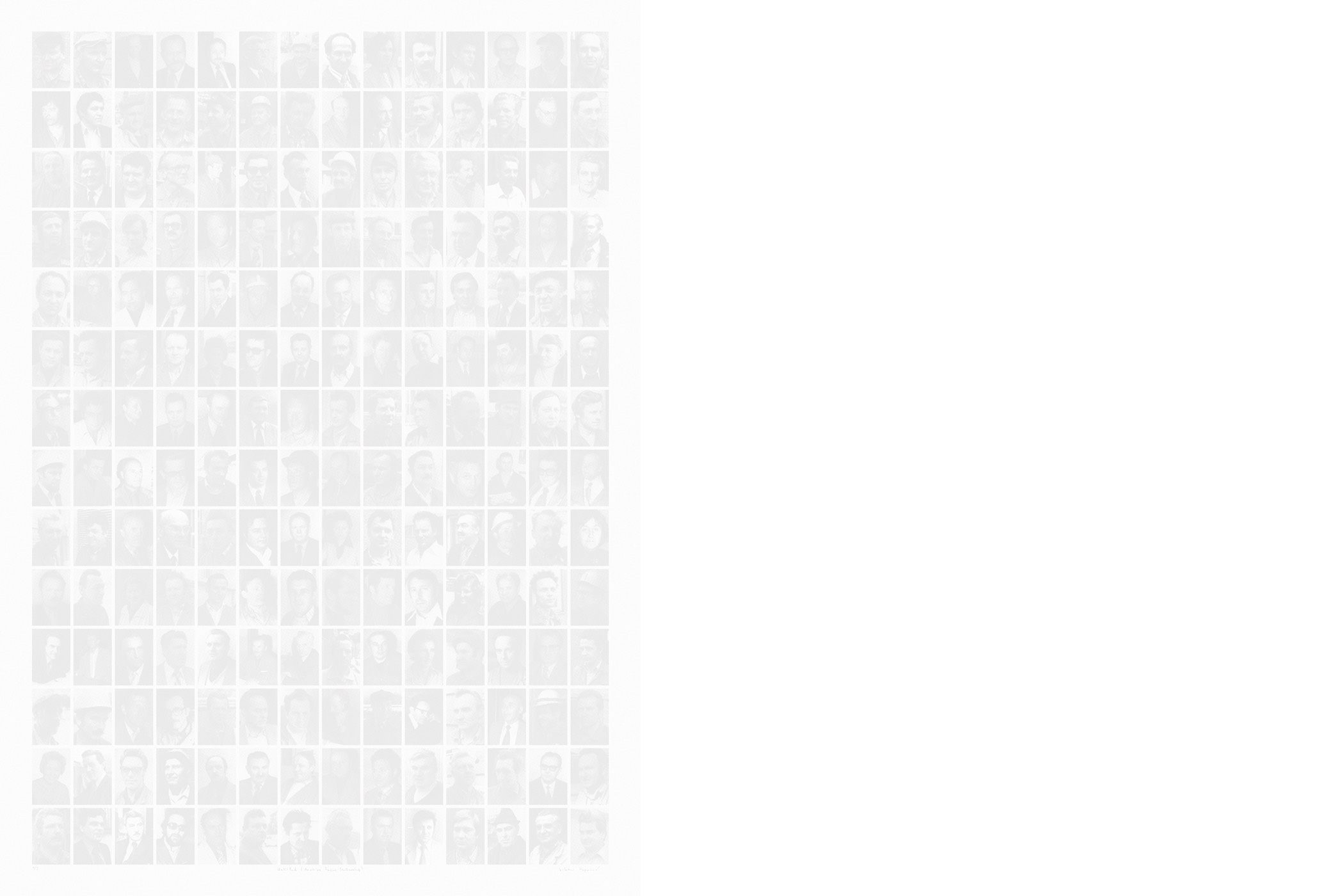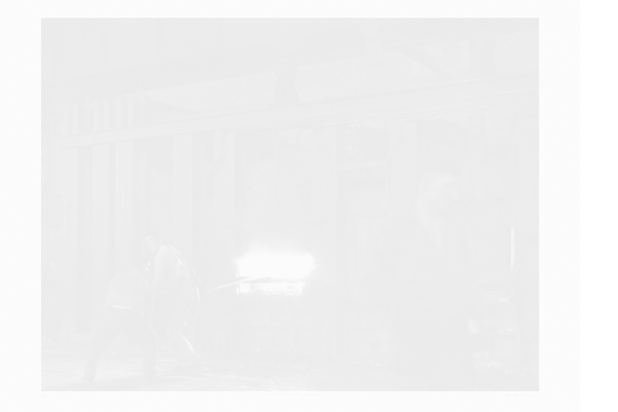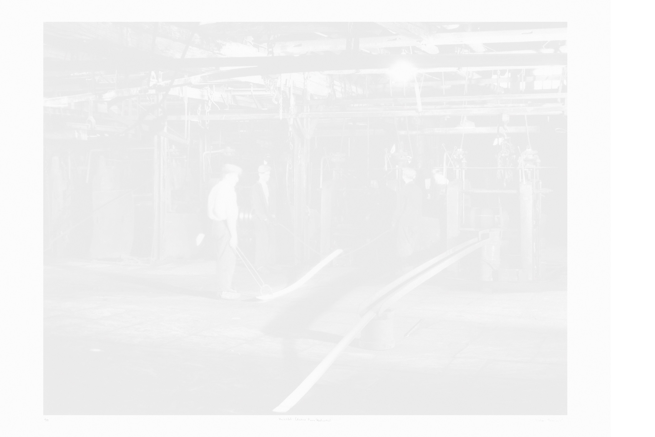 The first series consists of silkscreen prints that were made using photographs from the photographic collection of the Carinthian Regional Museum taken by Maks Dolinšek in the 1950s and 1960s. Most of these images depict various historical working processes at the steel factory that required the presence of a worker at each step. For one of the works, 196 portraits were selected from the museum's archive and assembled into a special commemorative composition. The ink used for the prints was made from dust collected at the steel production site. These monochrome prints are very bright and the pictures barely legible, resembling faded photographs and appearing as a pale, vanishing memory of a heroic past. They show the dynamics of the relationship between the socio-historical space of Ravne and the content from the steel factory, which imbues the works with a special symbolic meaning.