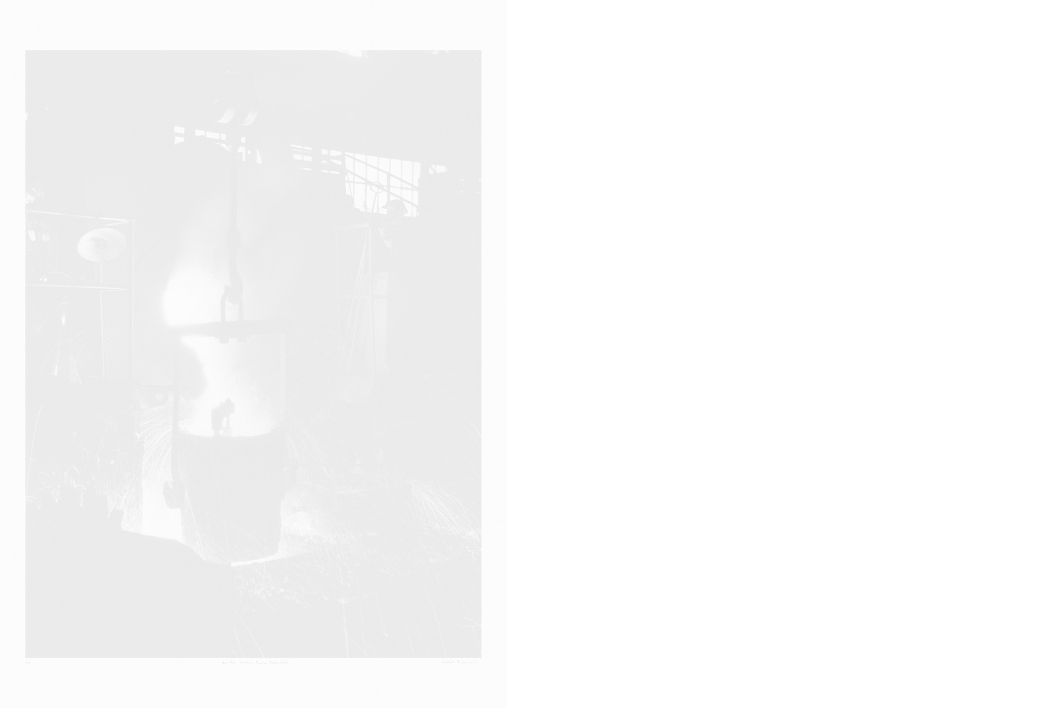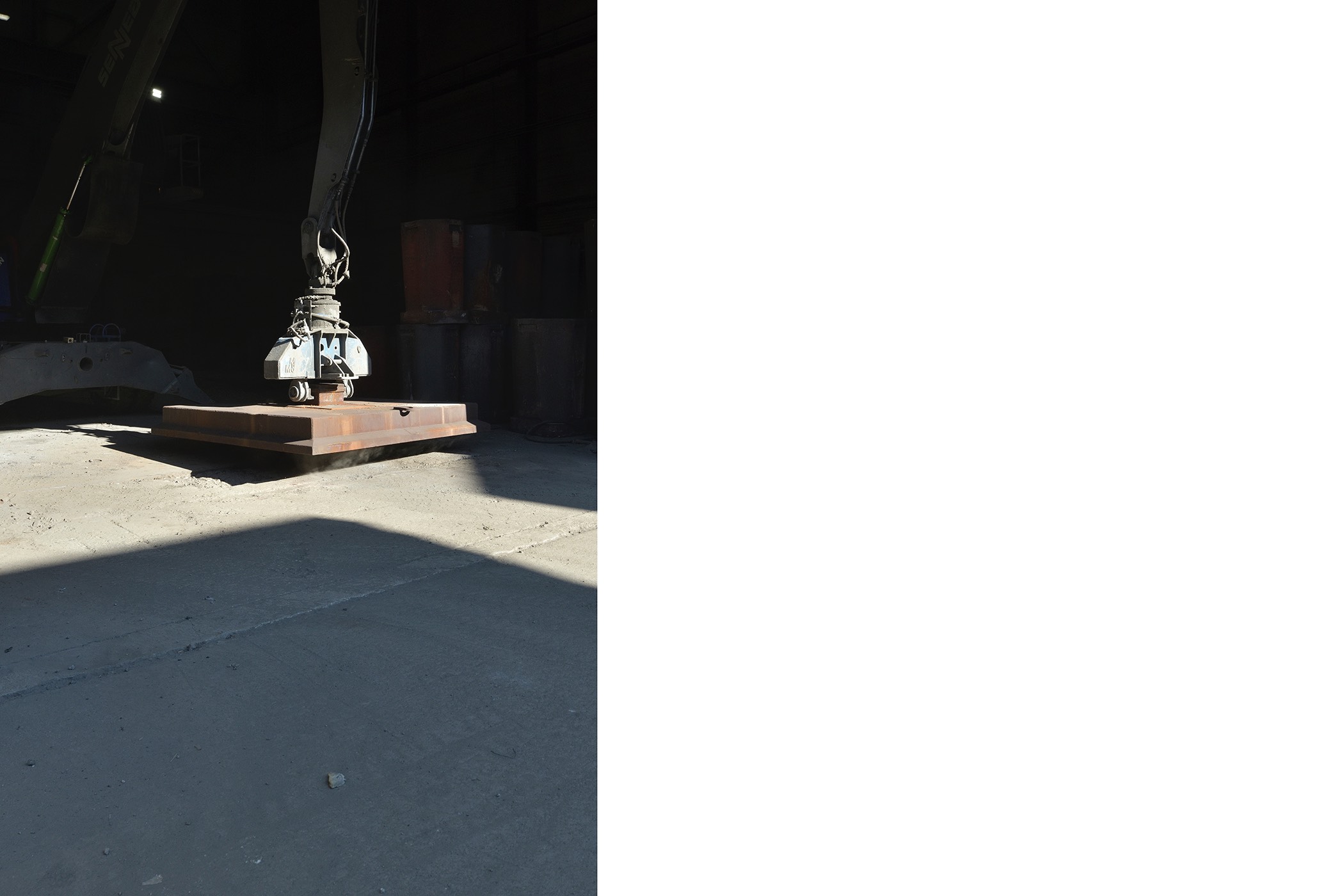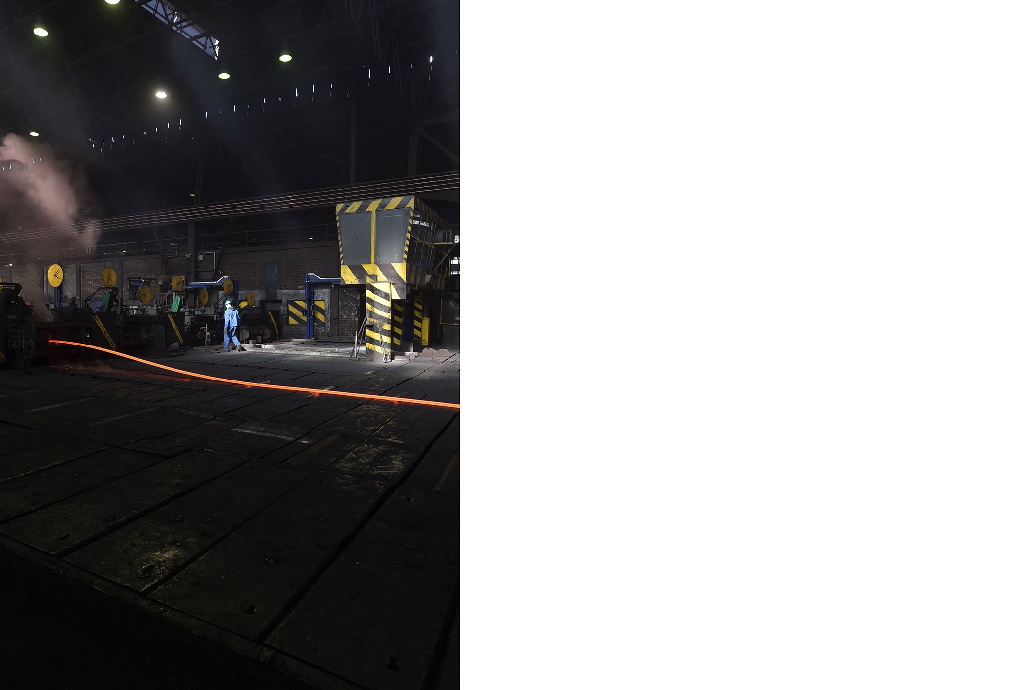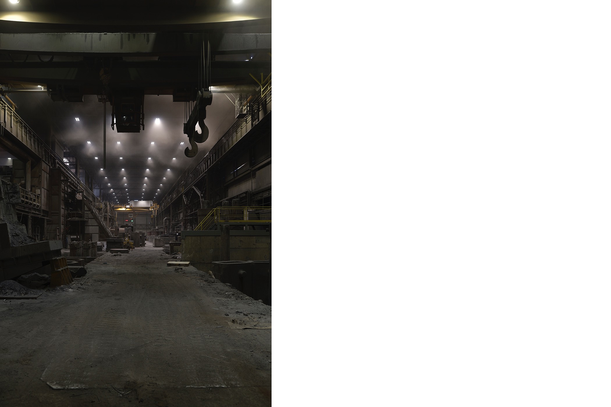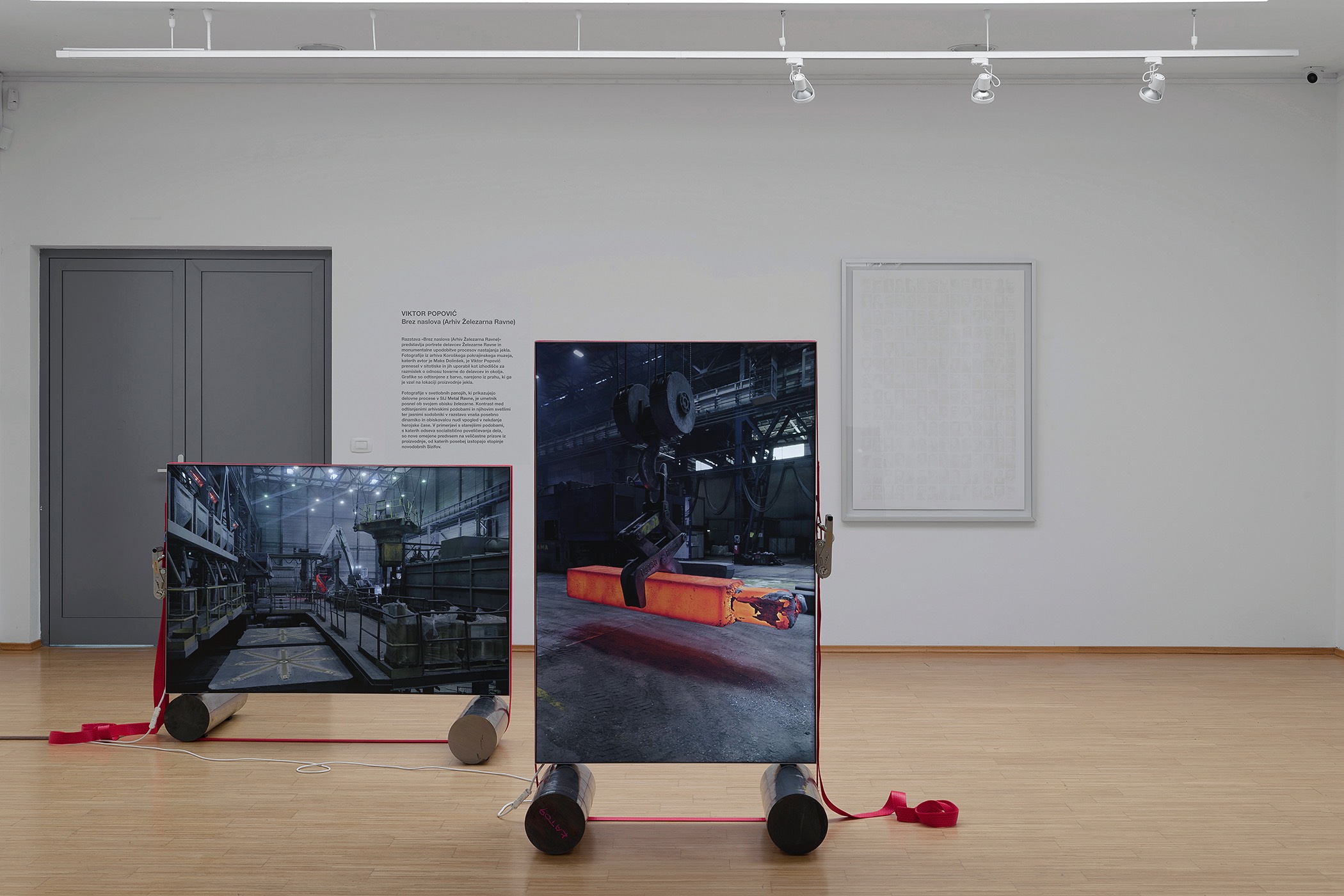 The second series of works consists of photographs displayed in light boxes that show some of the production locations at SIJ Metal Ravne, which were taken during a visit to the factory. The contrast between the printed archival images and their bright, clear modern counterparts creates an implicit tension that adds drama to the whole. In comparison to the older images, which reflect the socialist glorification of labor, the new ones are limited to internal perspectives and breathtaking interiors of industrial spaces. There are no workers, only a shadow that occasionally appears at the edge, and the steps of modern-day Sisyphuses. Their indifference to the impressive process of continuous transformation of steel into familiar and technically sophisticated forms transcends the significance of the results of their work in the Carinthian environment.