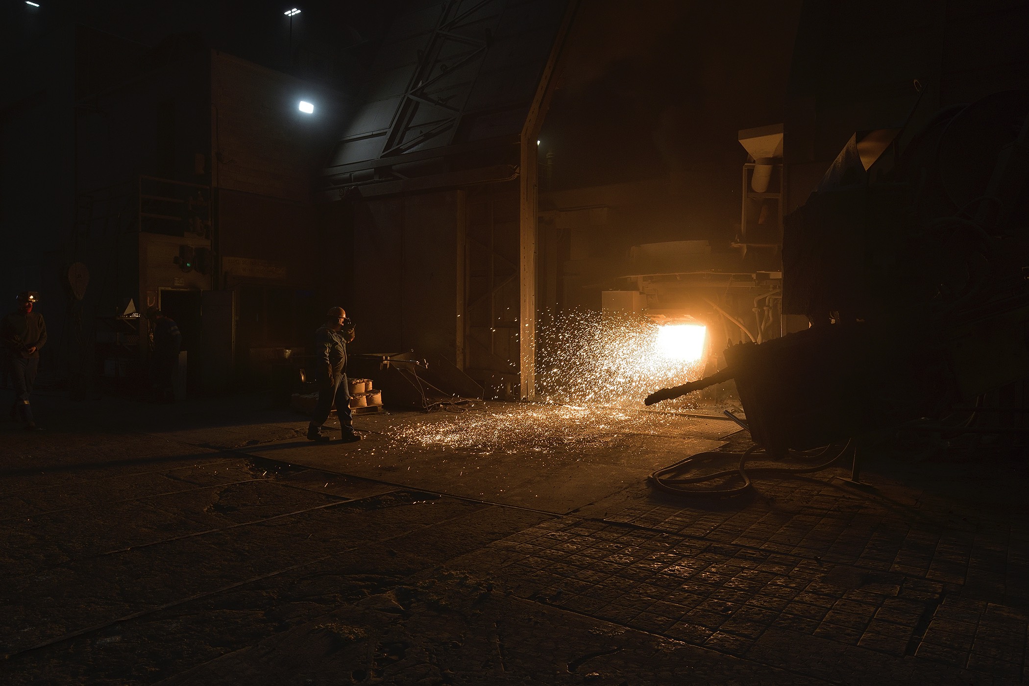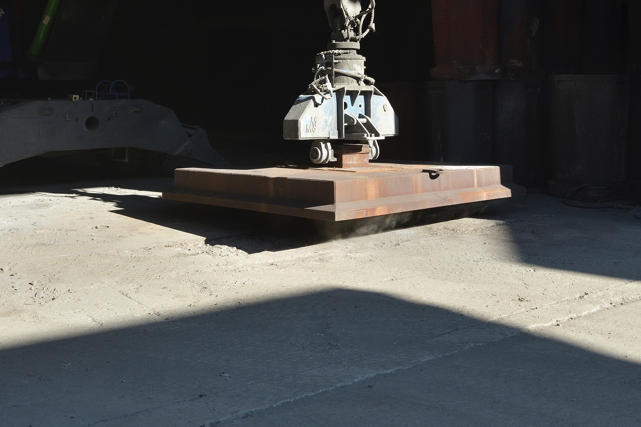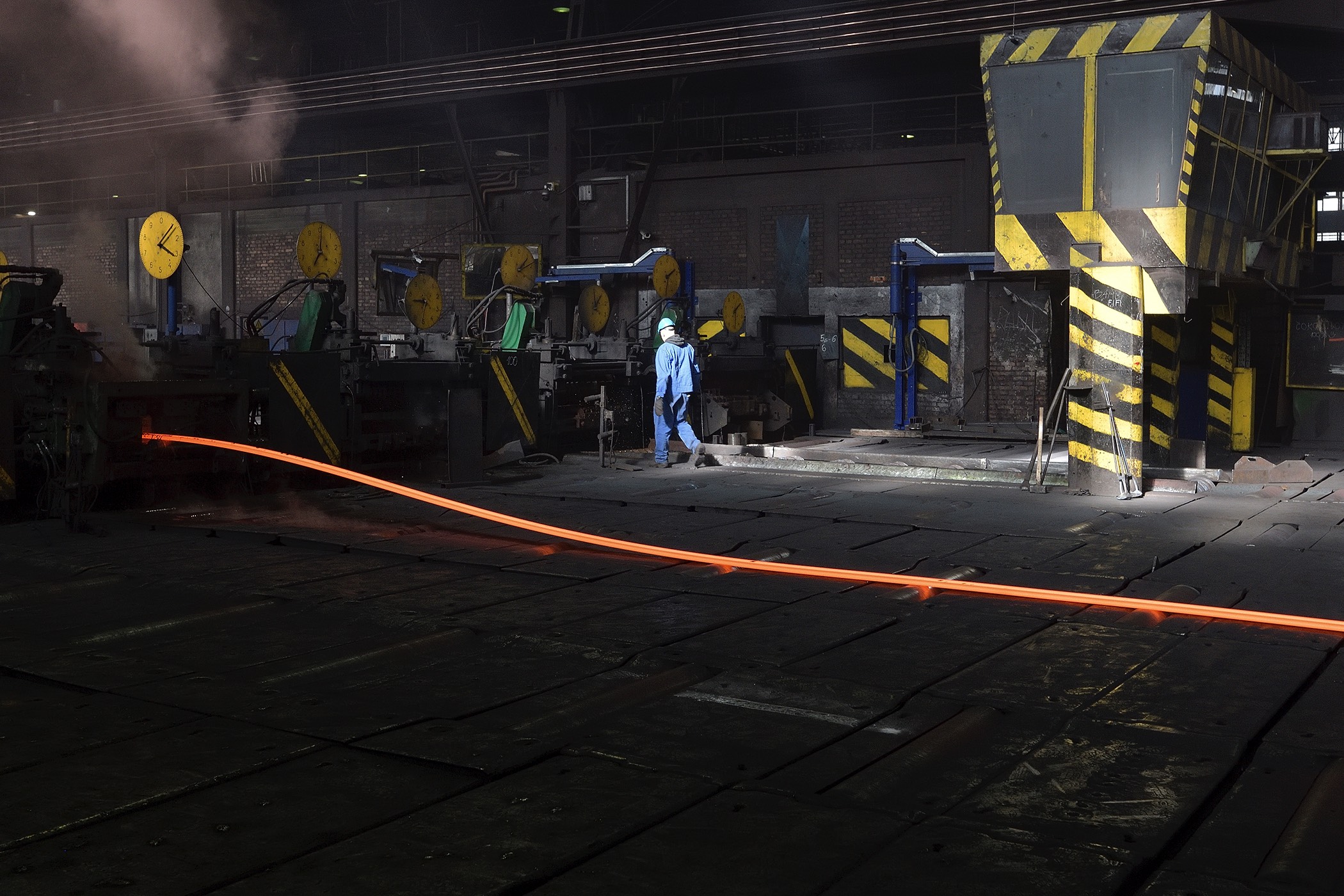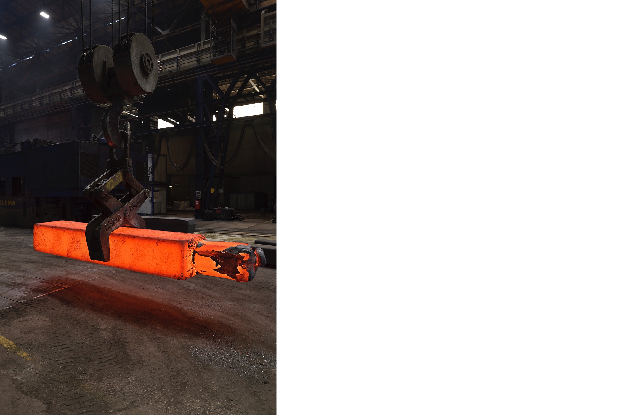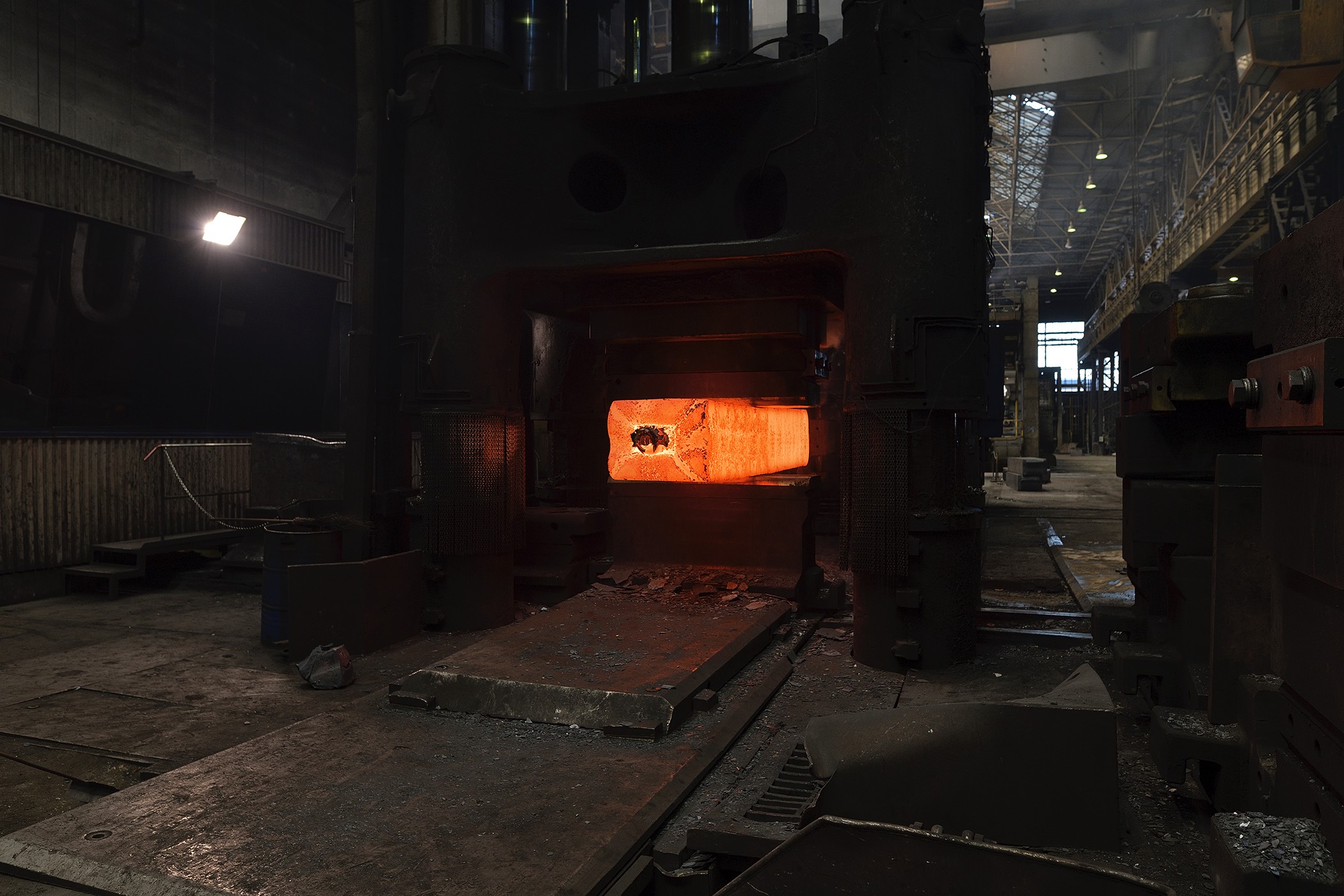 The second series of works consists of photographs displayed in light boxes that show some of the production locations at SIJ Metal Ravne, which were taken during a visit to the factory. The contrast between the printed archival images and their bright, clear modern counterparts creates an implicit tension that adds drama to the whole. In comparison to the older images, which reflect the socialist glorification of labor, the new ones are limited to internal perspectives and breathtaking interiors of industrial spaces. There are no workers, only a shadow that occasionally appears at the edge, and the steps of modern-day Sisyphuses. Their indifference to the impressive process of continuous transformation of steel into familiar and technically sophisticated forms transcends the significance of the results of their work in the Carinthian environment.