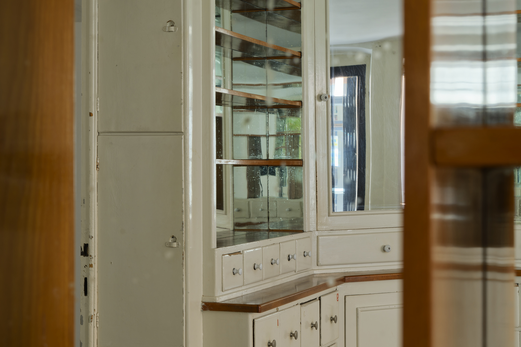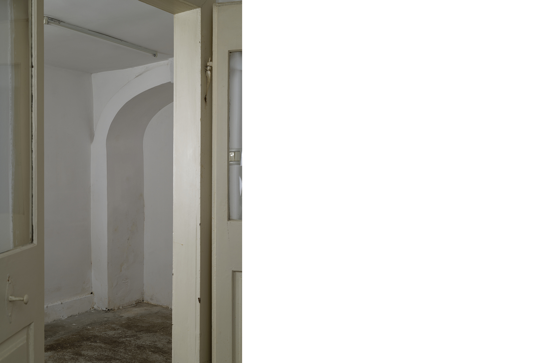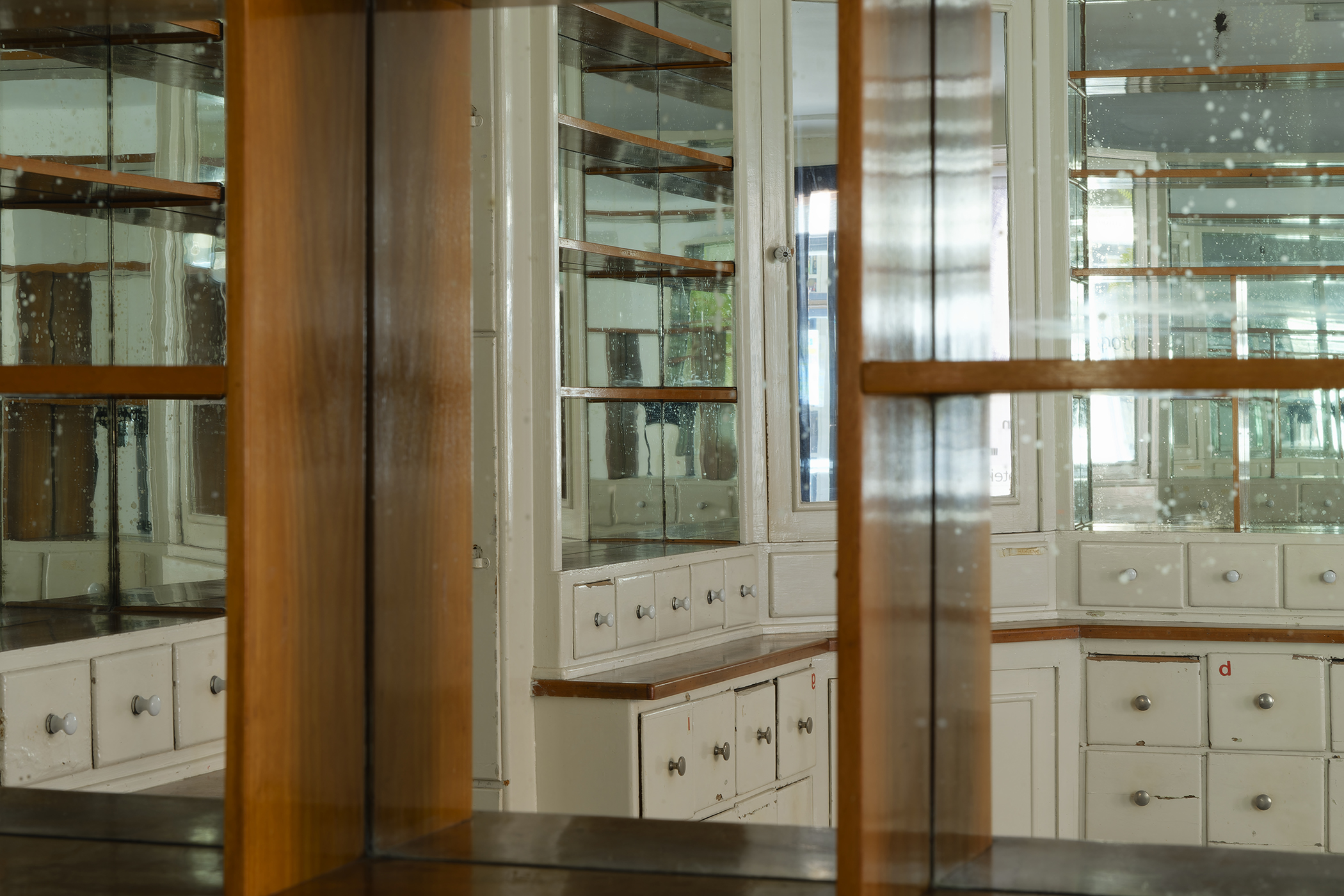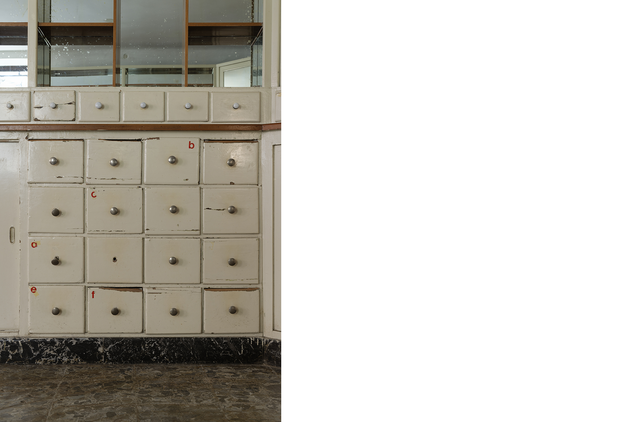 The second series is based on recent photographs of the gallery interior, capturing accumulated traces of time and use. These images are presented in freestanding, double-sided lightboxes, placed on a base constructed from drawers borrowed from the original white pharmacy cabinets still preserved within the space. The drawers, repurposed as sculptural foundations, anchor the photographic installation in the material memory of the site.